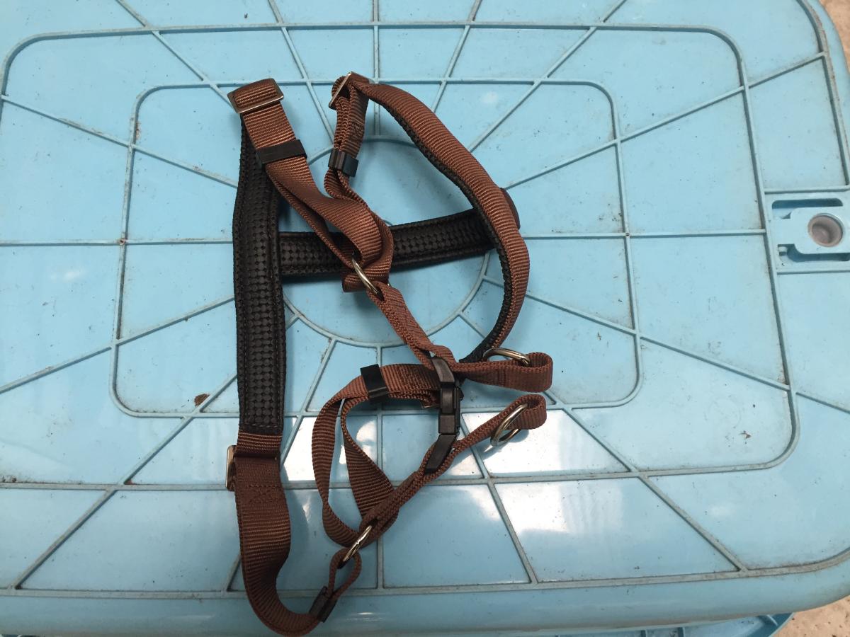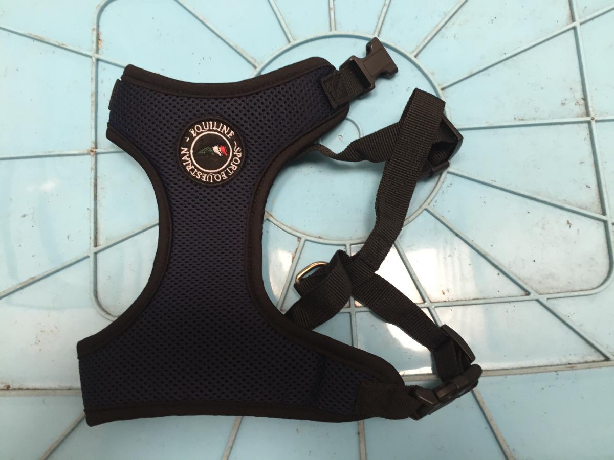 "Equiline Mansel dog harness" the tag says it is size large (never used): 20cm (L), 52cm waist, 42cm neck (measurements taken when open and unclipped)
