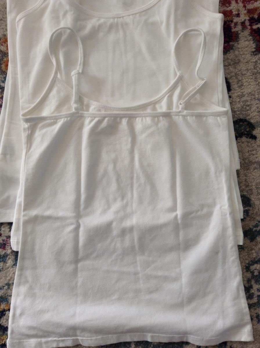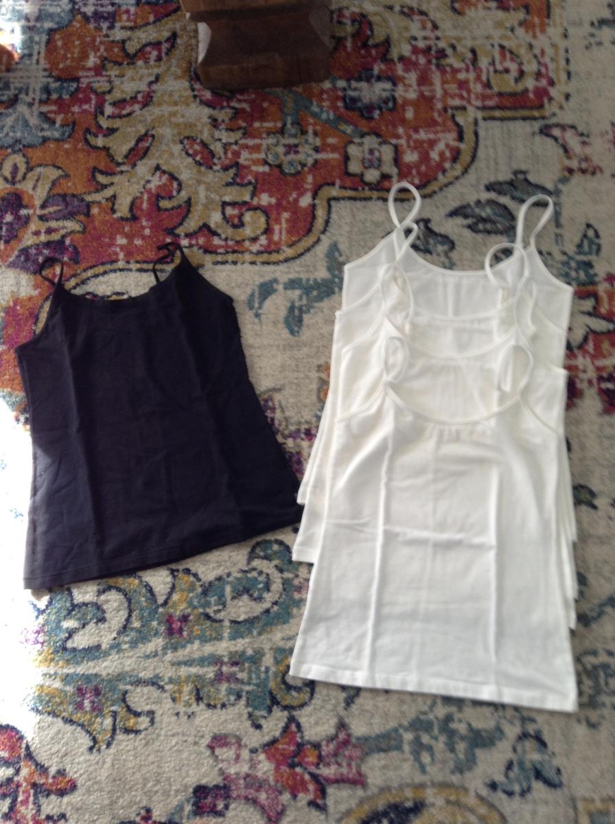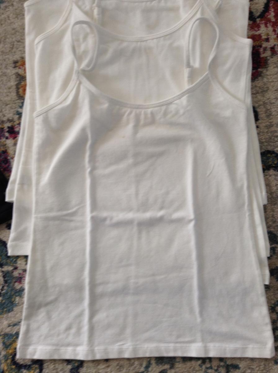 White Singlets - adjustable … View moreThis listing is for the pictured bulk lot of singlets; they are stretchy. They have never been worn so are in excellent condition. Only reason for selling is that my Mum has too many, she can't wear them all. They will fit a person who wears women's SMALL.