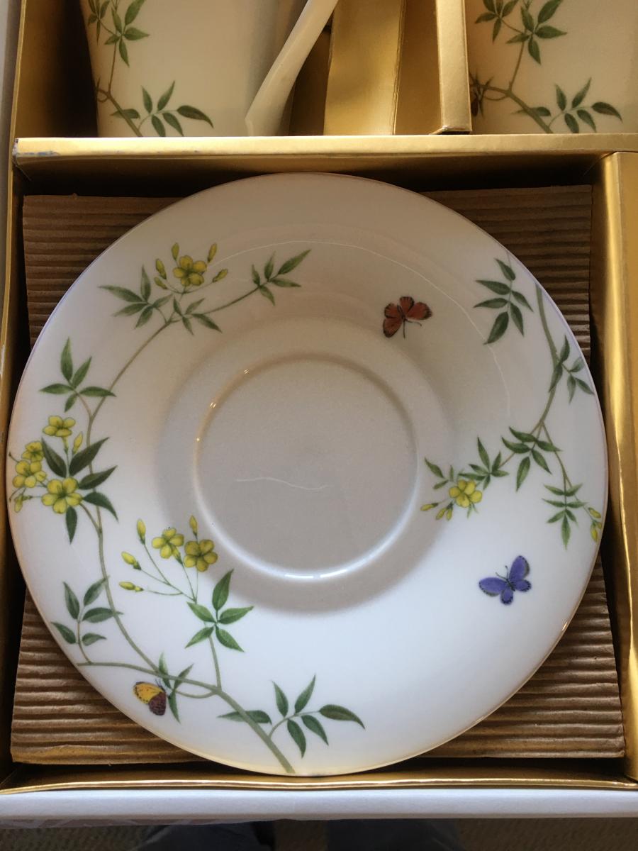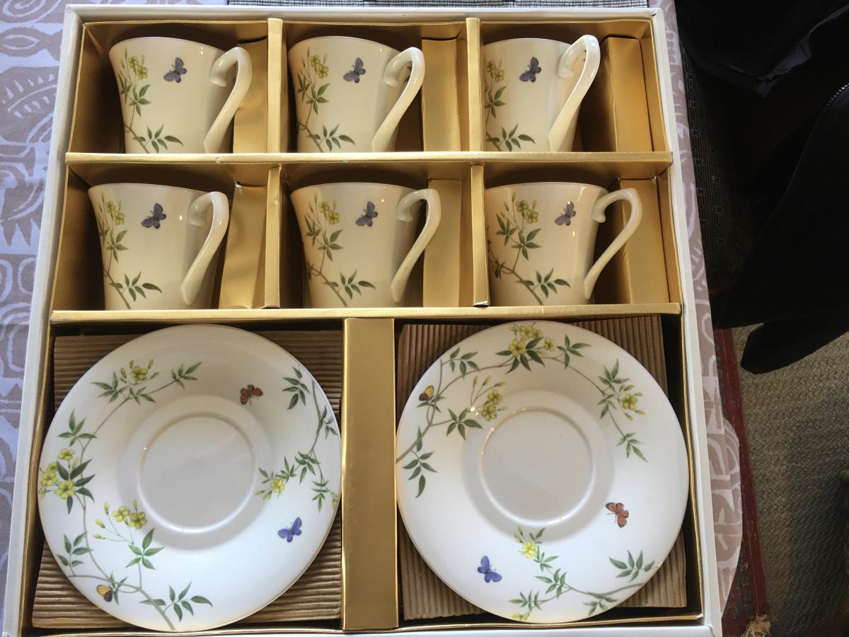 This listing is for the pictured set of cups and saucers (6 of each). It is in perfect condition and has never been used.