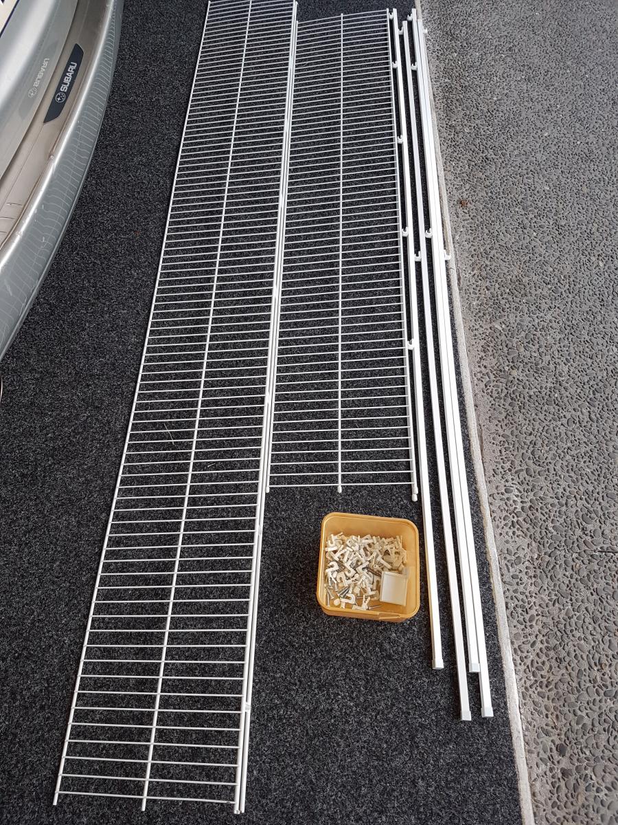 Wire rack shelving 2 lengths 1@ 1700 long 1@ 2350 long 310 deep. Left over from wardrobe redo comes with whats in pic 4 x legs and mounting toogles. $20