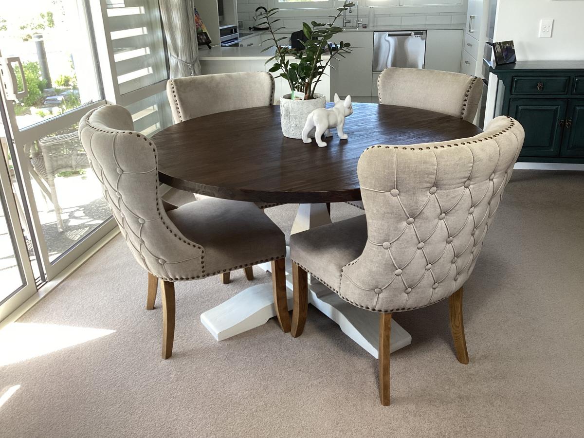 Dining room table with centre pedestal. (4ft 6in) circumference and four grey upholstered buttoned and studded chairs. Hardly used. In excellent condition. No marks or fading or scratches. Can be viewed at Villa 158 242 Pacific Lakes Village. Phone 0275757203 or email tonywasher@live.com
