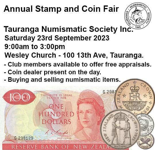 Do you have Coins, Banknotes, medallions, Trade Tokens, badges, medals.. laying around in the cupboard?. Do you want a fair price?. Well The Tauranga Numismatic Society are holding the Annual Coin Fair. Raffles and bargains to be had. A Dealer or two … View more9AM TO 3PM, 100 13TH AVE WESLEY CHURCH.