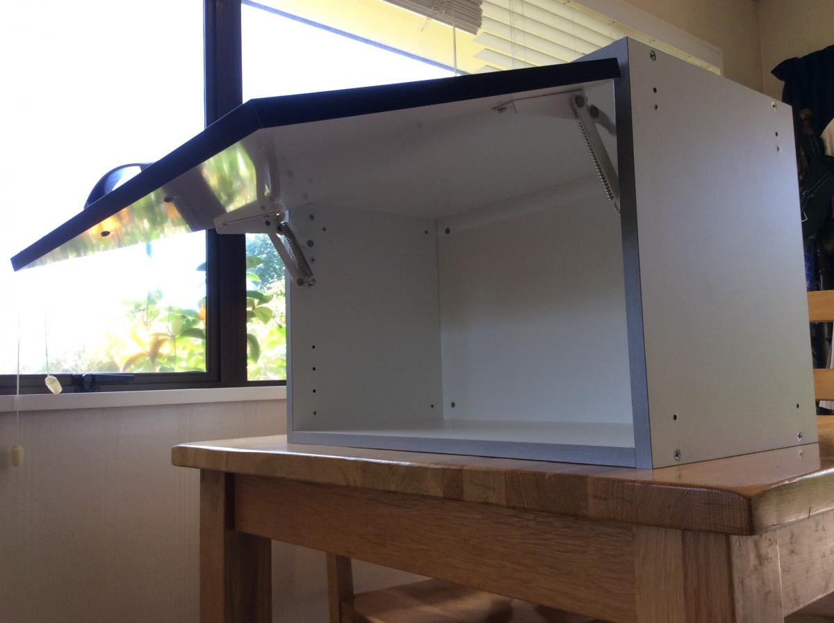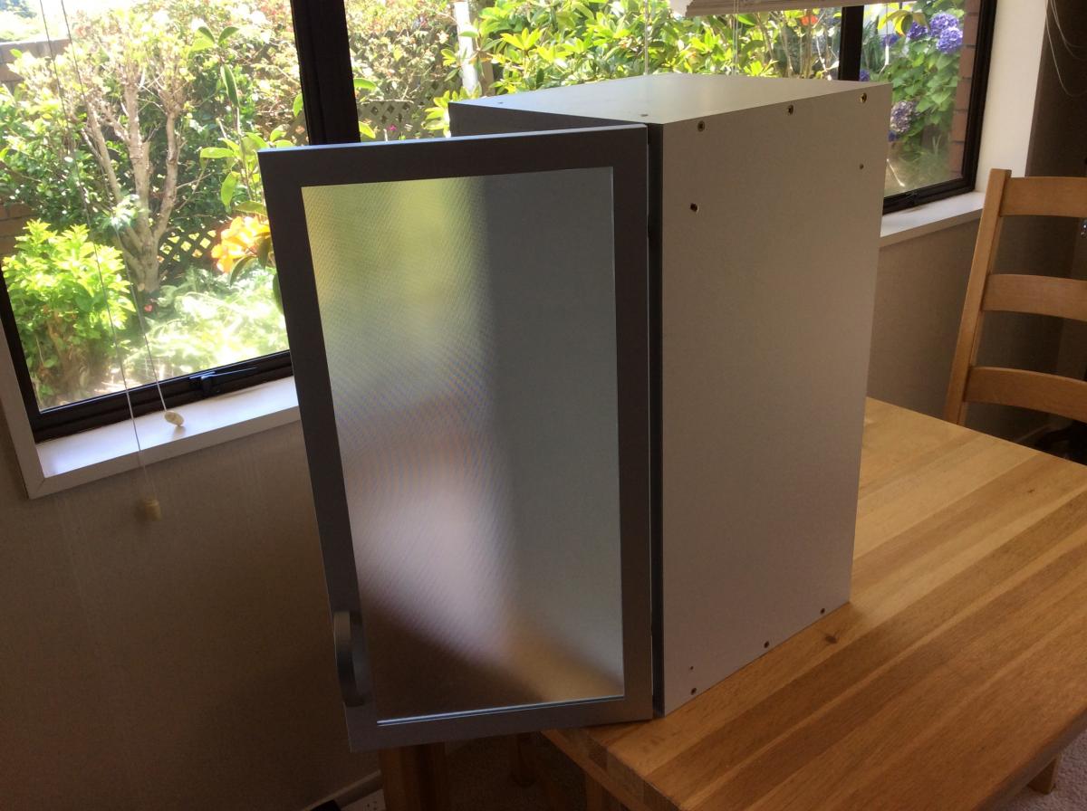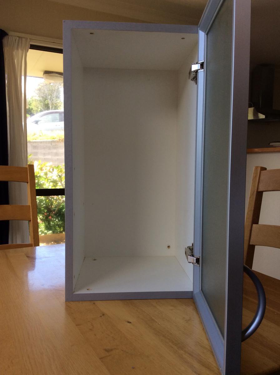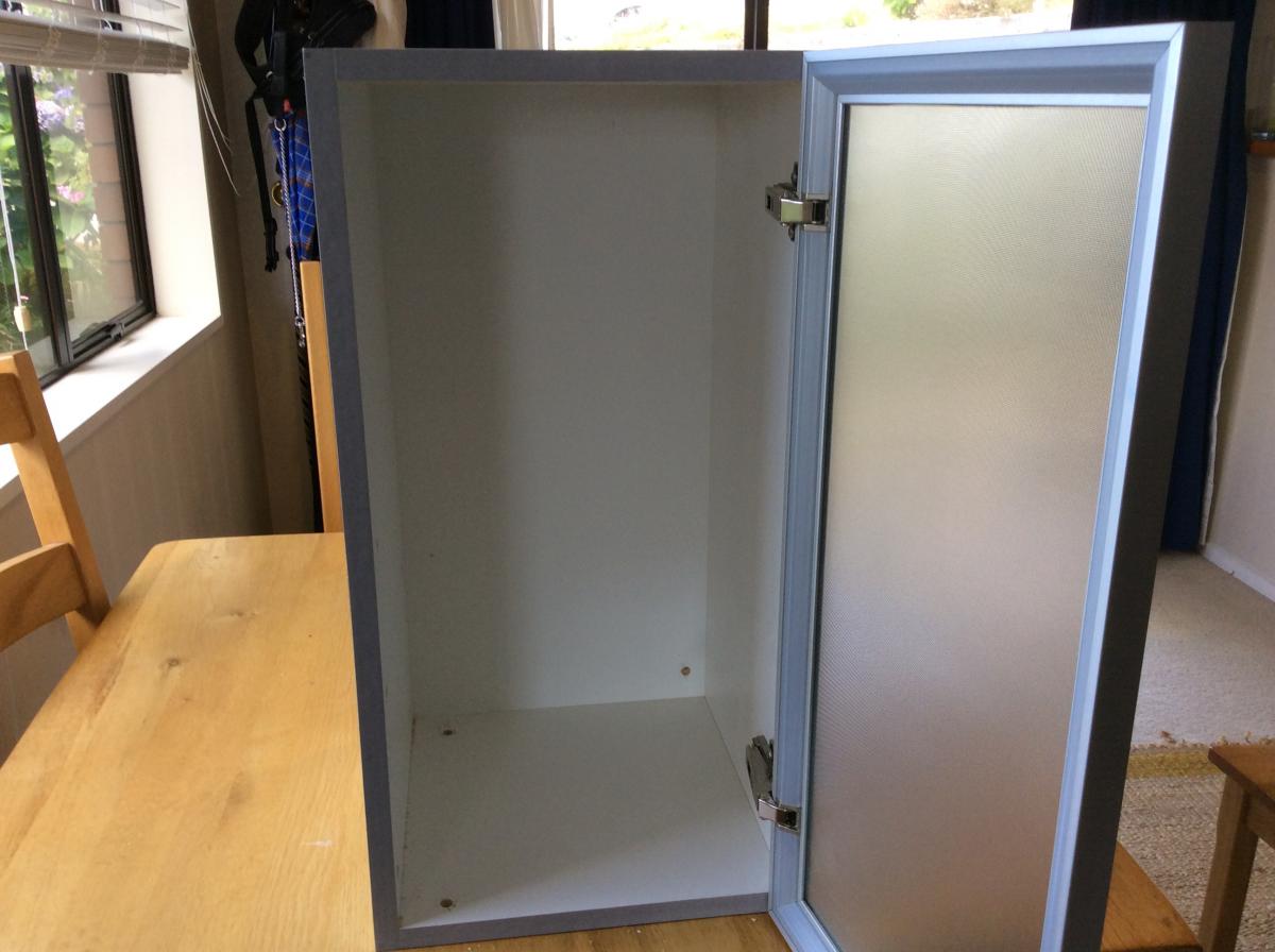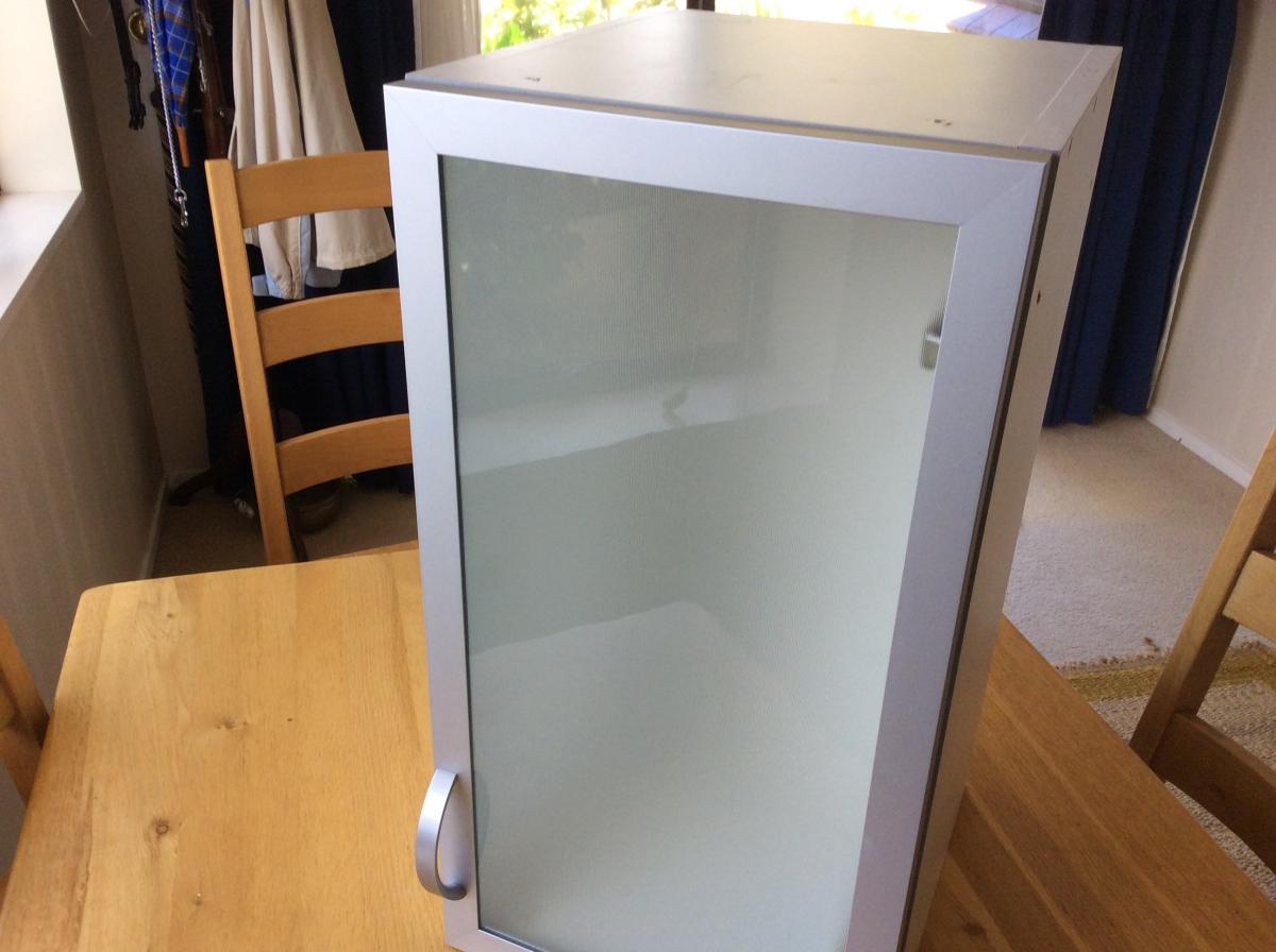 BESIDES EXISTING MOUNTING HOLES, THIS CABINET IS IN EXCELLENT CONDITION - (mounting holes can easily be covered with white stickies) PREVIOUSLY SHOW ROOM DISPLAY CABINET