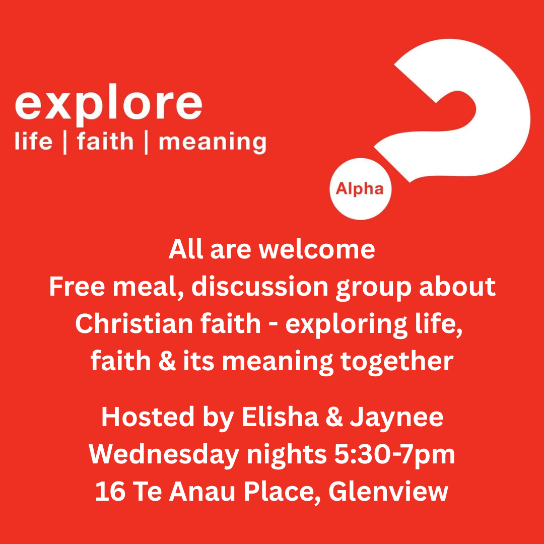 My wife Jaynee and I are starting up an Alpha course, which is an opportunity to learn more about life, faith and what it all mean from a Christian perspective. We will meet at our house (16 Te Anau Place, Glenview) each Wednesday @ 5.30-7pm. Please send me a message on 0210399068 or email … View moreMy wife Jaynee and I are starting up an Alpha course, which is an opportunity to learn more about life, faith and what it all mean from a Christian perspective. We will meet at our house (16 Te Anau Place, Glenview) each Wednesday @ 5.30-7pm. Please send me a message on 0210399068 or email cornerstone.elisha@gmail.com to come along! All are welcome, from all life-walks!