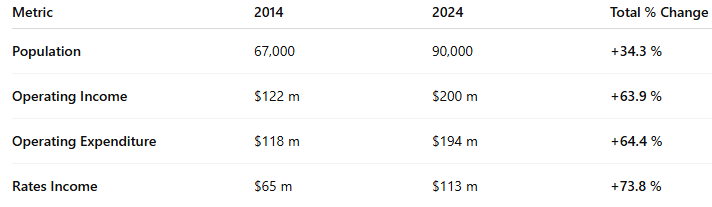 Based on the annual reports from the council, this has been the change in population, income, expense and rates in the past decade. These are not critiques in themselves but we do need to understand the measures that were taken to keep any cost increases in check, especially since the increase was … View moreBased on the annual reports from the council, this has been the change in population, income, expense and rates in the past decade. These are not critiques in themselves but we do need to understand the measures that were taken to keep any cost increases in check, especially since the increase was not equally consistent across population, income/expense, and rates.