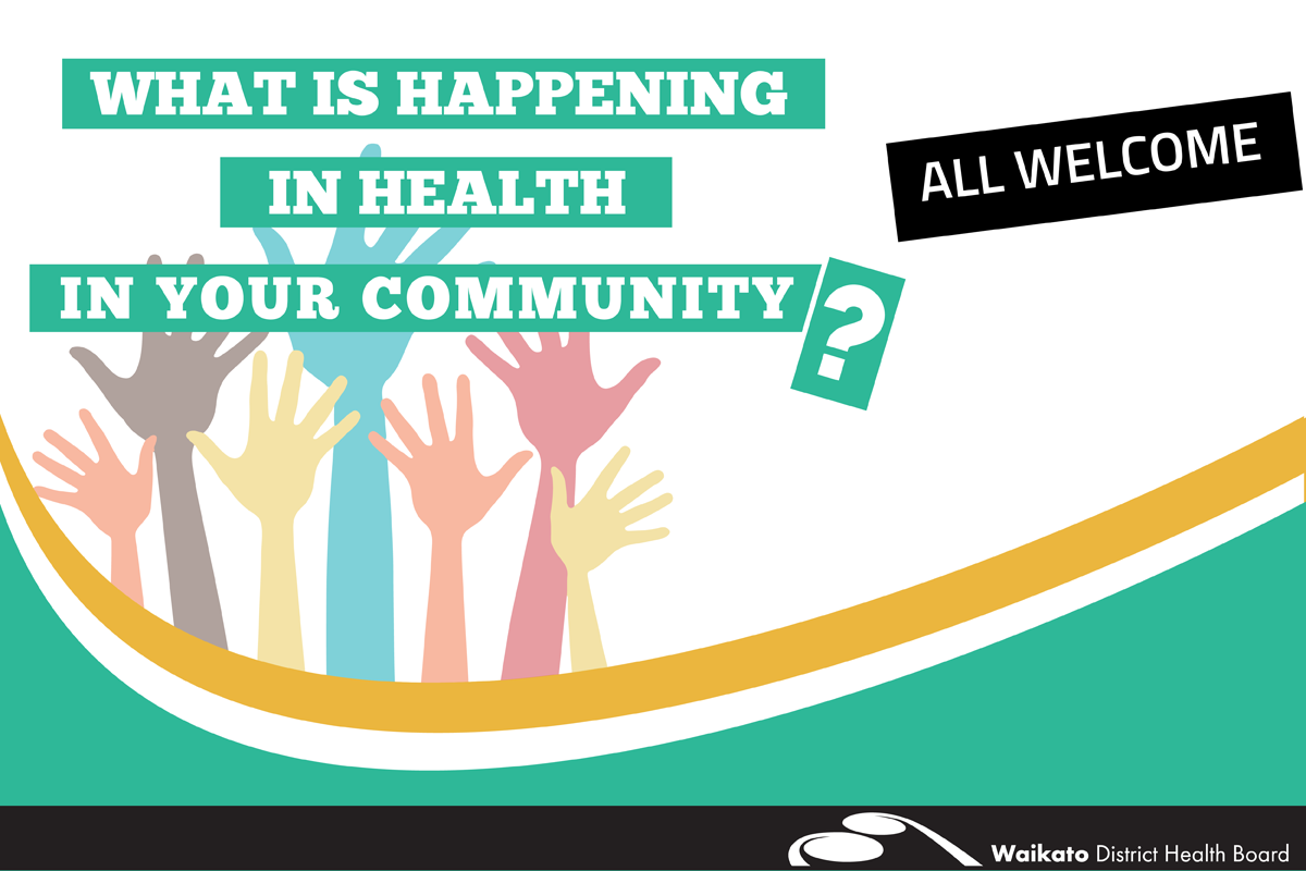 Hey neighbours, we at Waikato DHB want to hear what you have to say when it comes to health. Come along to your Community Health Forum. It'll be a gathering of local people like yourself, keen to listen to updates from the Waikato DHB, share their thoughts and talk about what matters to them … View moreHey neighbours, we at Waikato DHB want to hear what you have to say when it comes to health. Come along to your Community Health Forum. It'll be a gathering of local people like yourself, keen to listen to updates from the Waikato DHB, share their thoughts and talk about what matters to them in healthcare in their community.
