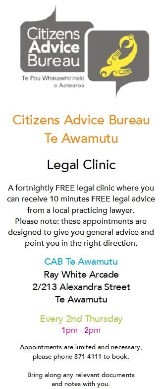 Next Thursday (26th January) is our first Legal Clinic for 2017. We have a few FREE 10 minute appointment slots available. If you would like to book or would like more information, please phone 871 4111, or pop into our bureau to discuss your options. Please Note: Appointments are necessary and … View moreNext Thursday (26th January) is our first Legal Clinic for 2017. We have a few FREE 10 minute appointment slots available. If you would like to book or would like more information, please phone 871 4111, or pop into our bureau to discuss your options. Please Note: Appointments are necessary and limited.