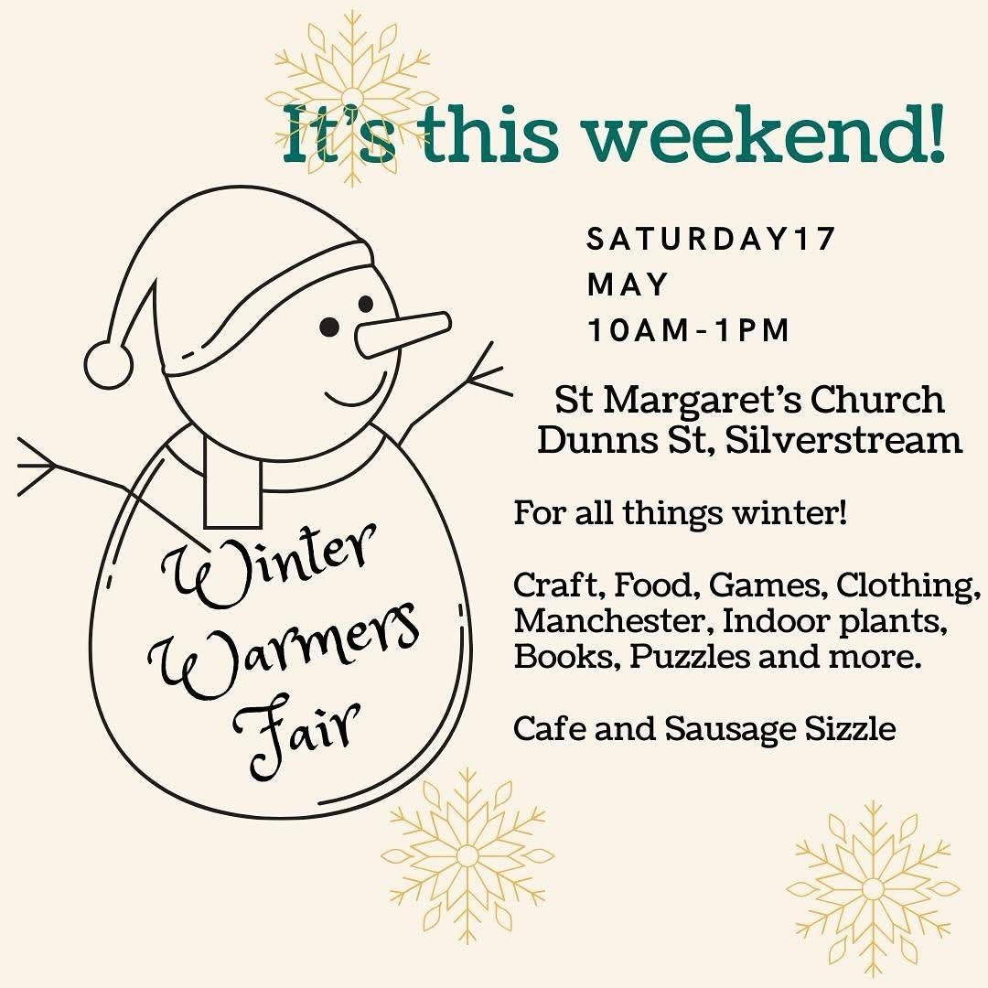 Looking forward to this Saturday’s Winter Warmers Fair starting at 10 am at St Margaret’s Church, Dunns St, Silverstream