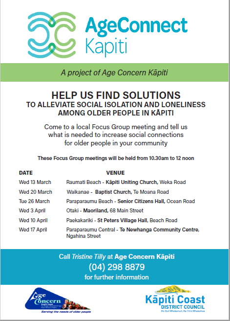 Come to one of these Focus Groups and have a say in what we can do to help the Social Isolated and Lonely on the Kapiti Coast.