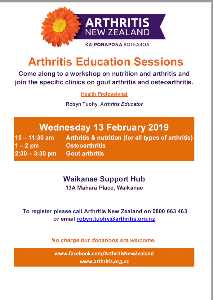 Robyn Tuohy, Arthritis Educator will be here tomorrow running a series of clinics on Arthritis & Nutrition, Osteo & Gout.