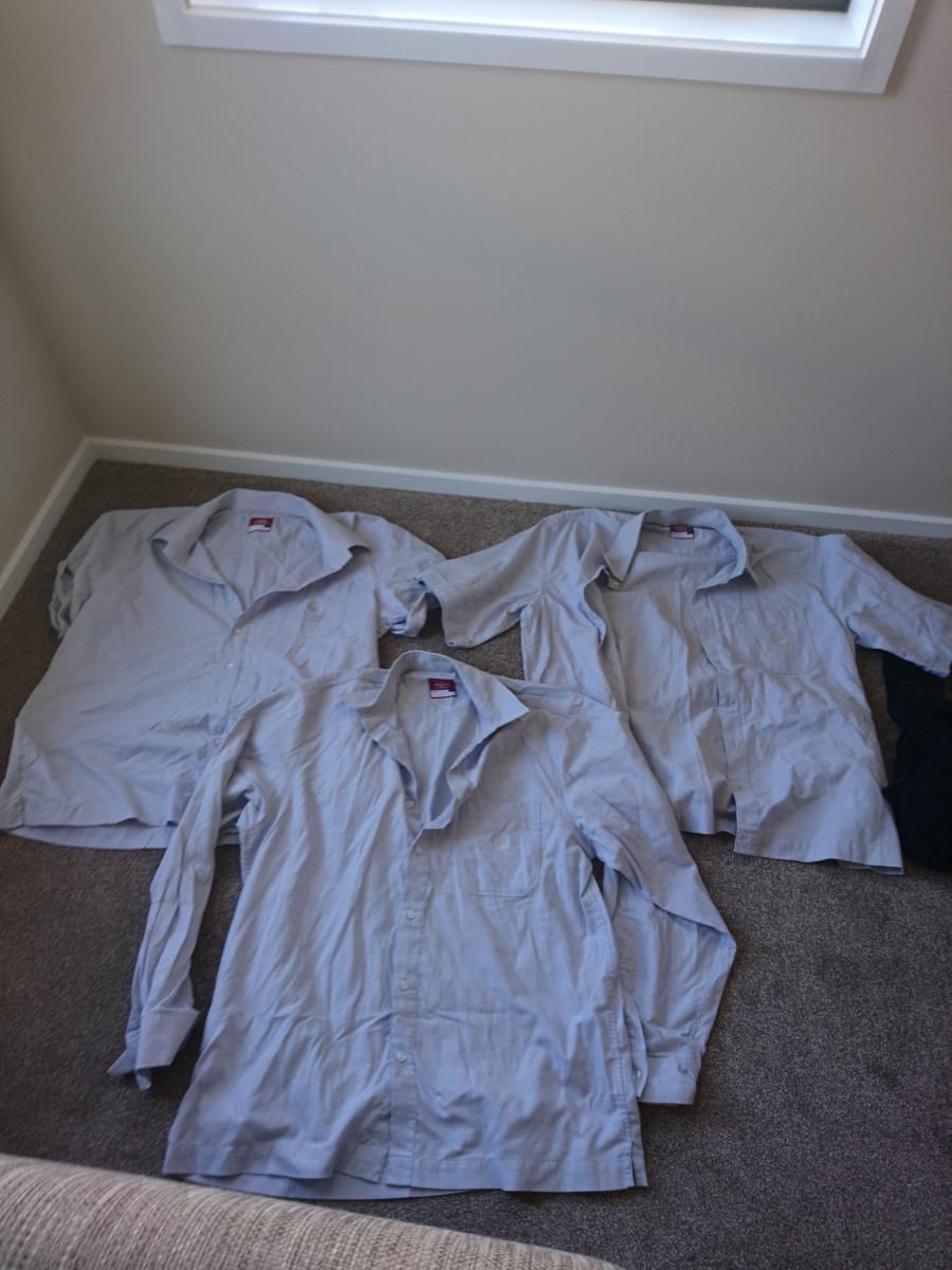 $15 for each item. I have three size M short sleeve shirts. 3 Large shirts of which one is long sleeve. Two pairs of shorts one size 88 and the other size 80. all of these items are in good condition. Pick up at Waikanae.