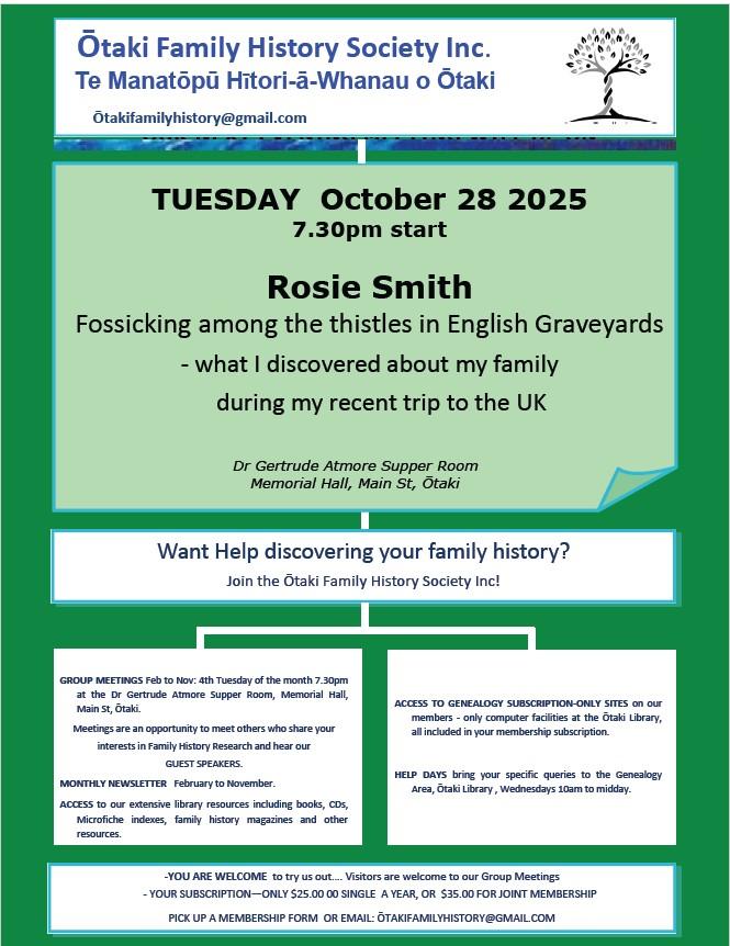 The topic is presented by Rosie Smith on "Fossicking among the thistles in English Graveyards" - what I discovered about my family during my recent trip to the UK