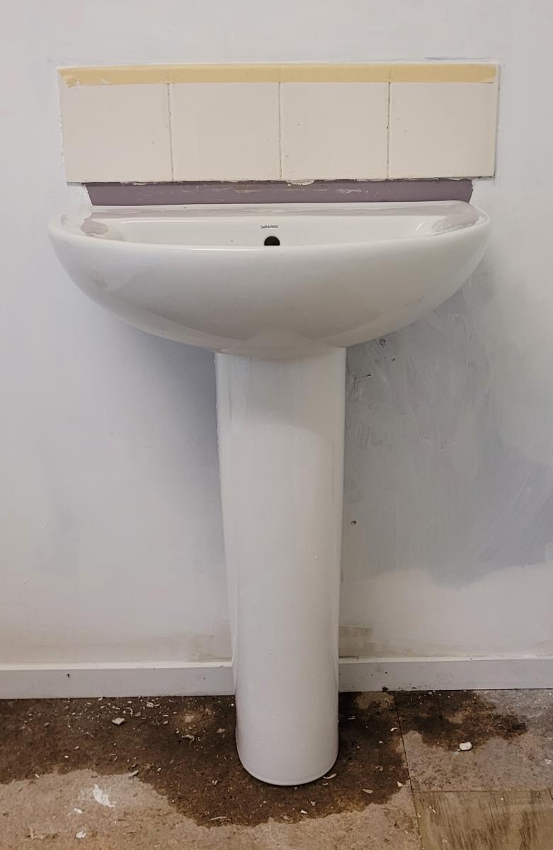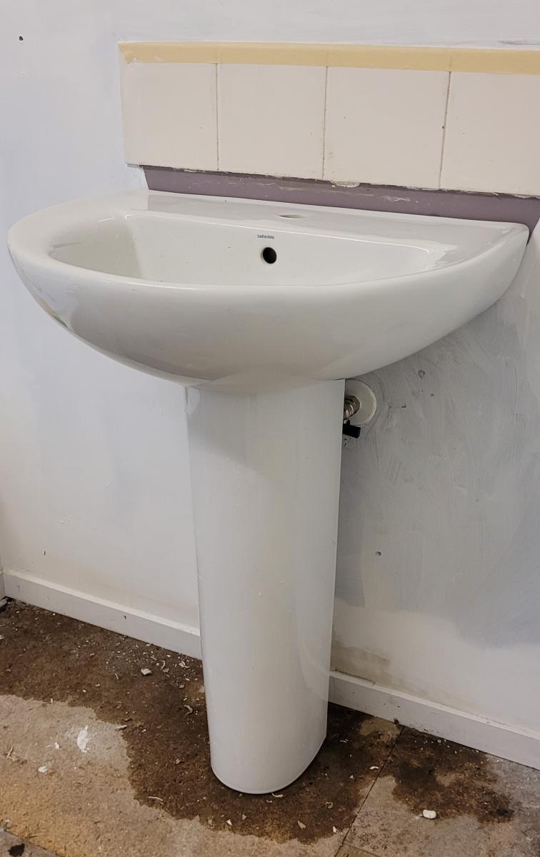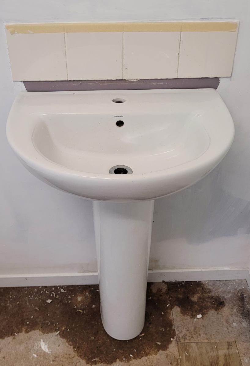 Bellavista (made in Spain) porcelain pedestal sink, 700w x 450 d x 825h. Sink unit secures to the wall. Concealed tap feed and waste pipe (in the pedestal). Pick up from Otaki. Available immediately.