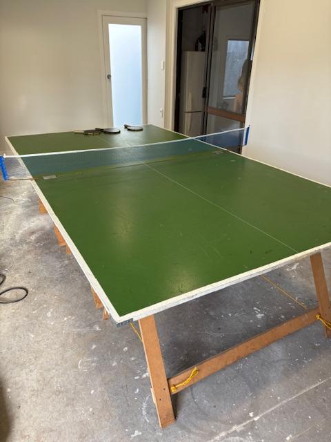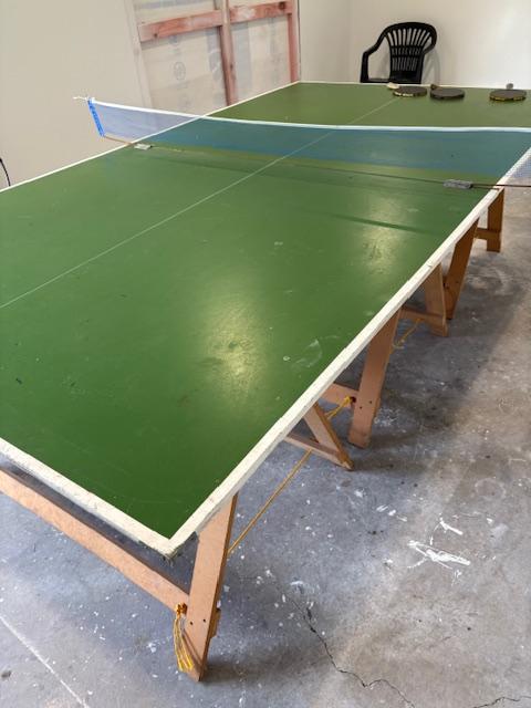 A full sized table tennis table plus net made bade by hobbyist. The table is supported by trestles and a fixed net. It is easy to be stored as the table has hinges and can be folded; the trestles van likewise be folded. Well used by a family for 15 plus years but remains in first class order.