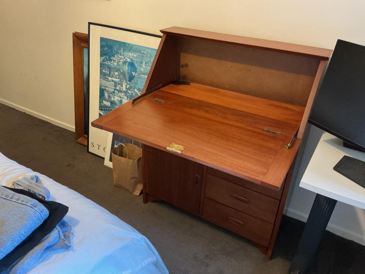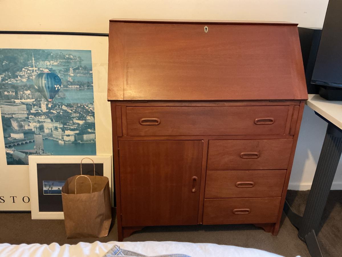 Opens up into a desk and has 3 small drawers, 1 large drawer and 1 small door. Ink stain in corner.