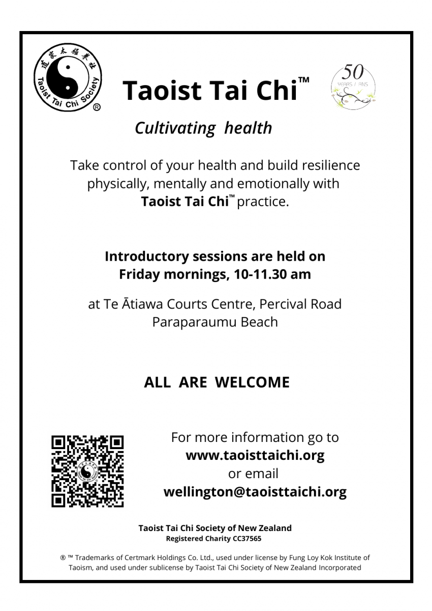 As part of Kāpiti Seniors’ October 2025 there is a tai chi ‘Have-A-Go’ Session Friday 3 October, 10-11.30 am, Te Ātiawa Courts Centre,