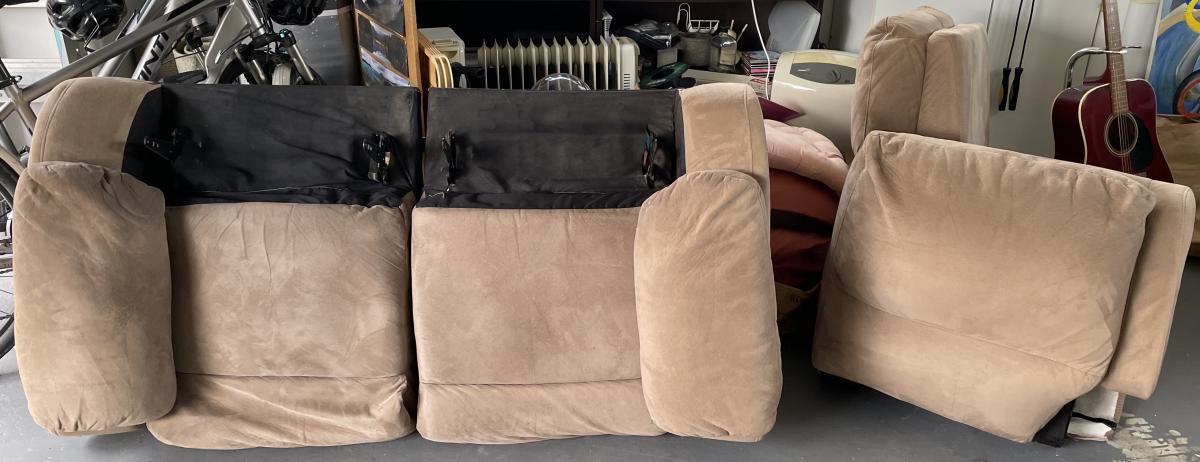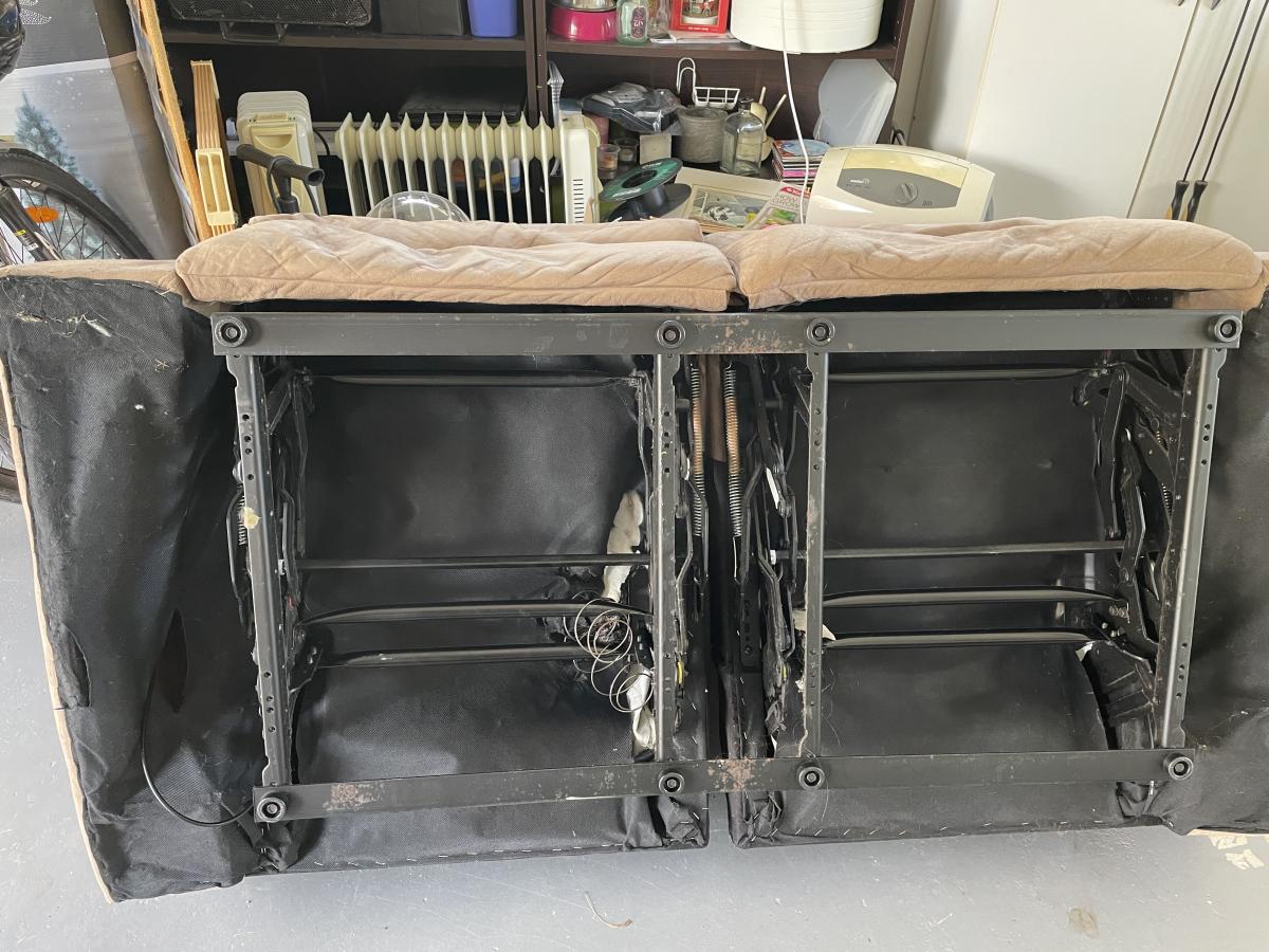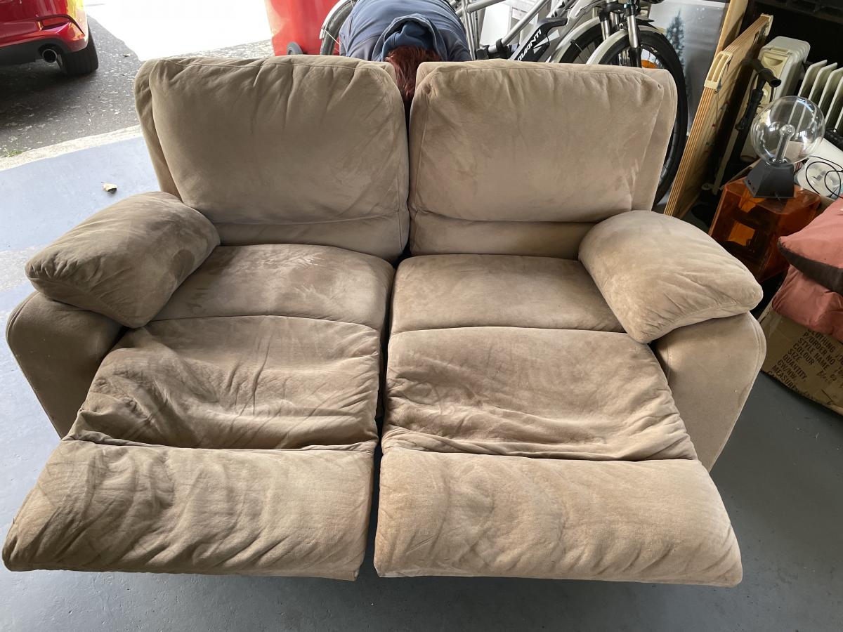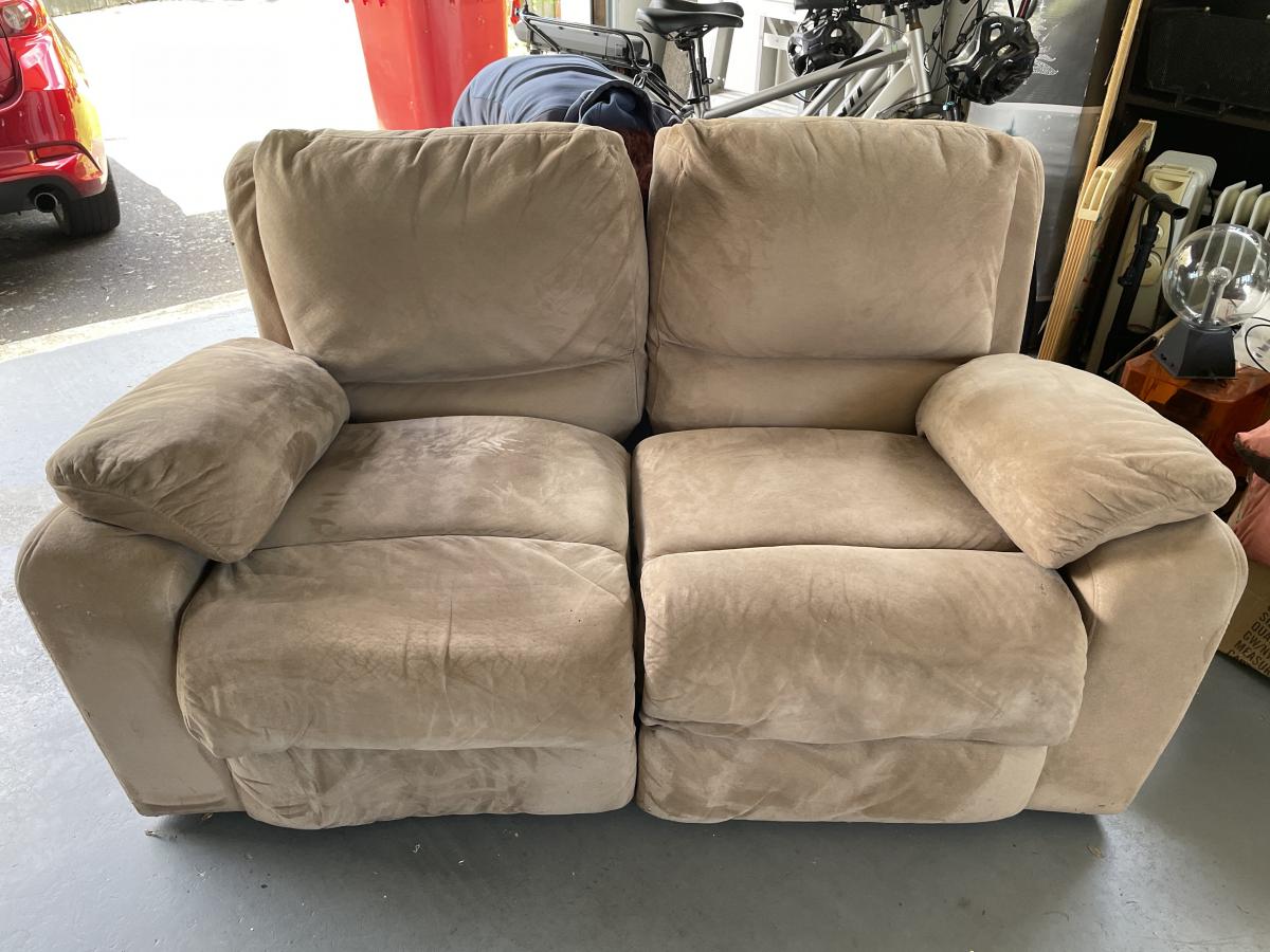 A 2-seater recliner couch in reasonable used condition. A couple of springs loose on one chair. Has had the backs removed for transport but still quite heavy. Buyer must pick up.