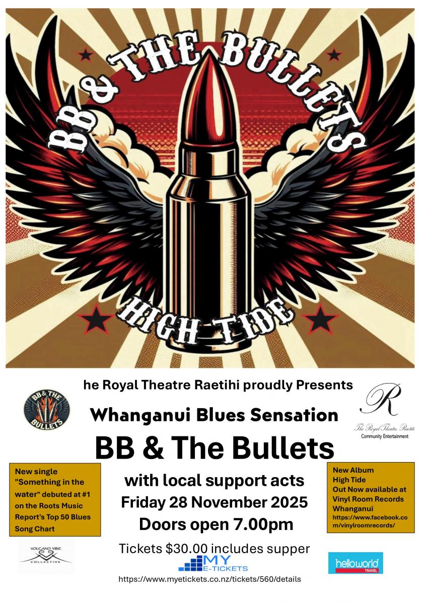 Whanganui, New Zealand's own chart topping Blues Rock band BB and The Bullets headline at The Royal 28 November. With a number one single around the world and a brilliant debut album high Tide this a must see show. With local support acts yet to be announced.