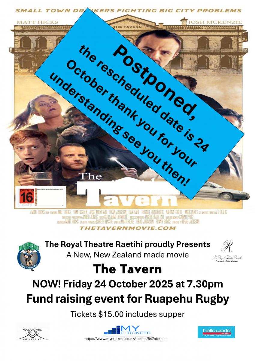 The Tavern is a new comedy movie, filmed in Cambridge New Zealand and depicts 5 guys and their journey to save their local watering hole from demolition and development to a shopping Mall. Written and Directed by Matt hicks, who also has a bit of a role in it too. This is a fund raising event for … View moreThe Tavern is a new comedy movie, filmed in Cambridge New Zealand and depicts 5 guys and their journey to save their local watering hole from demolition and development to a shopping Mall. Written and Directed by Matt hicks, who also has a bit of a role in it too. This is a fund raising event for the Ruapehu Rugby Club. 24 October
