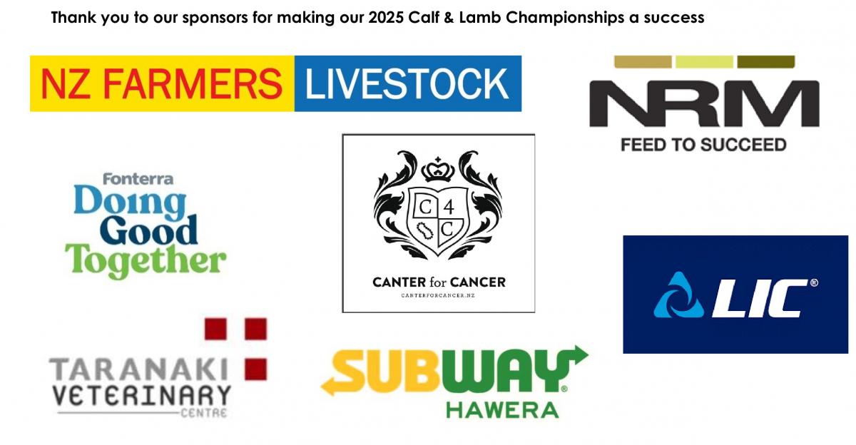 A big thank you to the sponsors of our 2025 Egmont Lamb & Calf championships that will be held here at the Egmont Show Grounds this weekend: NZ Farmers Livestock - Taranaki, NRM, Canter for Cancer, Taranaki Vet Centre Pets, Fonterra, LIC & Subway Hawera.