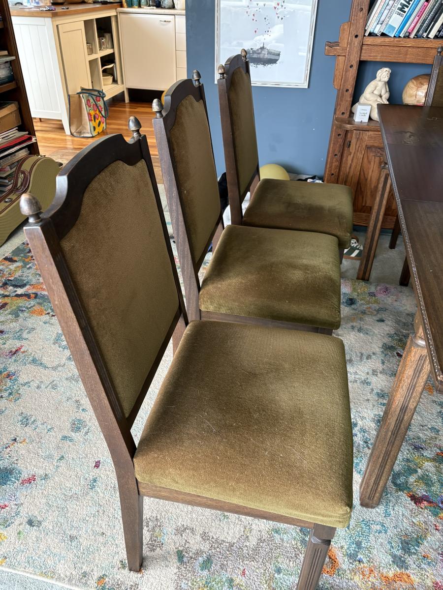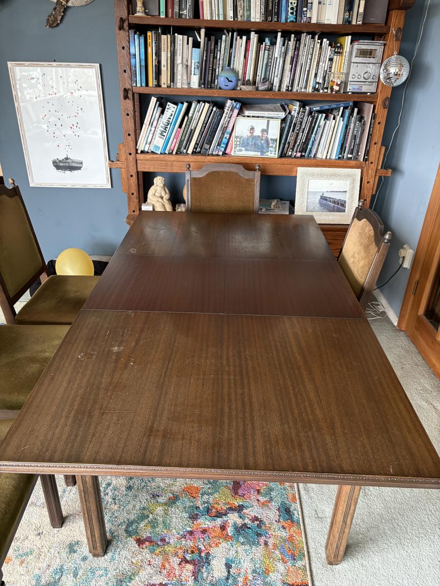 Details on table edge, chairs … View moreLovely traditional dining table and six matching chairs. Some wear and tear on the varnish, but well made and in good condition.