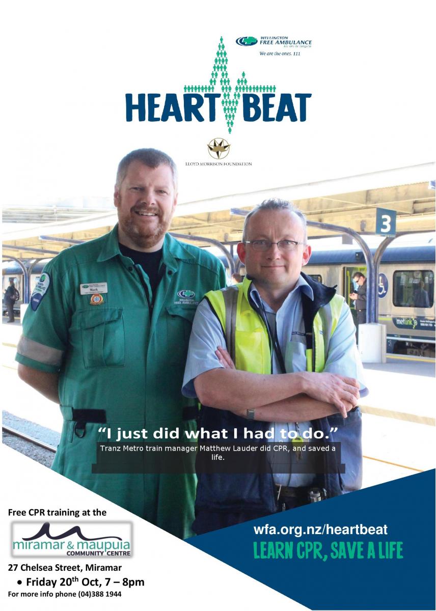The Wellington Free Ambulance is holding a free CPR training session at the Miramar & Maupuia Community Centre on Friday 20th October, 7 - 8pm. Sessions are fun, interactive, and participants come away with the knowledge and confidence they’ll need should they ever have to help someone in … View moreThe Wellington Free Ambulance is holding a free CPR training session at the Miramar & Maupuia Community Centre on Friday 20th October, 7 - 8pm. Sessions are fun, interactive, and participants come away with the knowledge and confidence they’ll need should they ever have to help someone in cardiac arrest. Contact Grant on 388 1944 or grant@mmcc.org.nz to register.