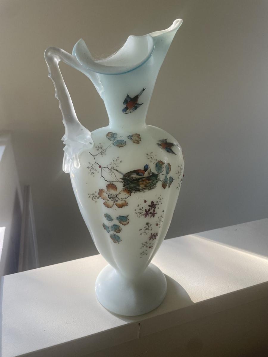 The item in the image is an antique Mt. Washington Pairpoint hand-painted glass pitcher, likely from the late 19th or early 20th century. It features a satin finish with a blue and white color gradient, hand-painted flowers, and butterflies. The pitcher stands approximately 10.75 inches tall and 5 … View moreThe item in the image is an antique Mt. Washington Pairpoint hand-painted glass pitcher, likely from the late 19th or early 20th century. It features a satin finish with a blue and white color gradient, hand-painted flowers, and butterflies. The pitcher stands approximately 10.75 inches tall and 5 inches wide