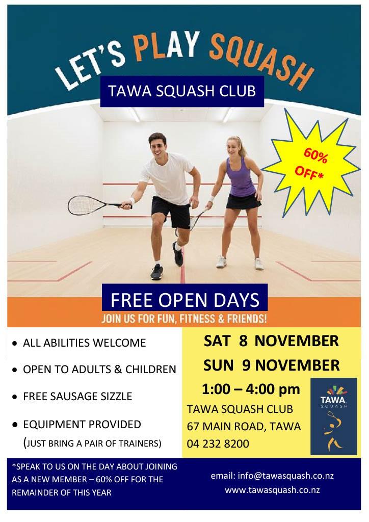 FREE SQUASH.......never played before? Played before and ready for a comeback? Playing now and want some more squash buddies to play against? Yes??? Then Tawa Squash is where you want to be - 2 open days on the weekend of 8/9 November.