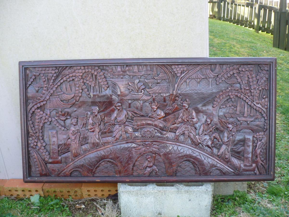 Unique vintage coffee table top with intricate Chinese carving of Chinese figures and horses on a stone bridge with what is possibly a 'troll' or the chinese equivalent under the bridge. In great condition but unfortunately doesn't have legs. However this would also make an … View moreUnique vintage coffee table top with intricate Chinese carving of Chinese figures and horses on a stone bridge with what is possibly a 'troll' or the chinese equivalent under the bridge. In great condition but unfortunately doesn't have legs. However this would also make an incredibly stunning wall hanging or feature, either in the home or in a chinese shop or restaurant perhaps?