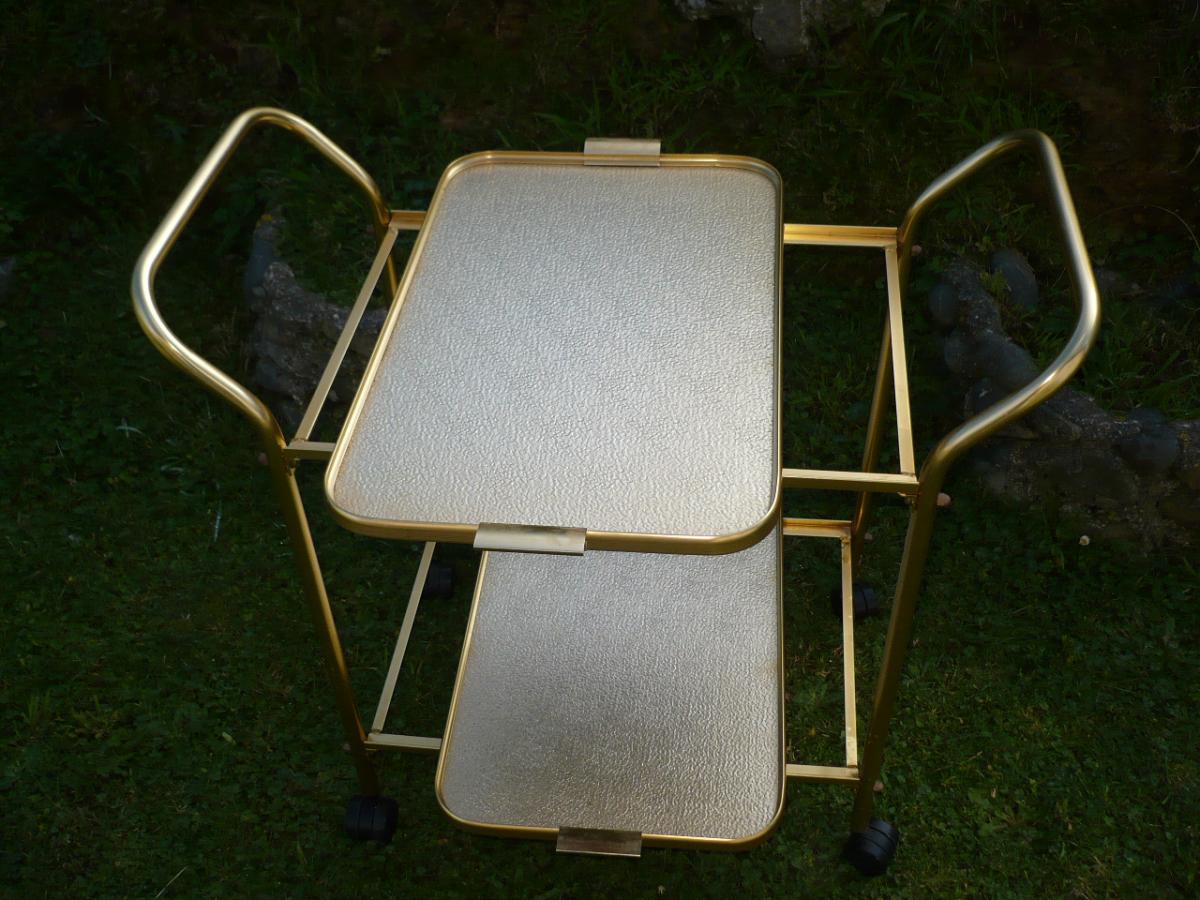 Stunningly simple but versatile 2 tier light weight metal trolley, gold plated, on wheels so easily maneuverable and as shown in the photo both trays are sturdy and removable should you wish to use separately.