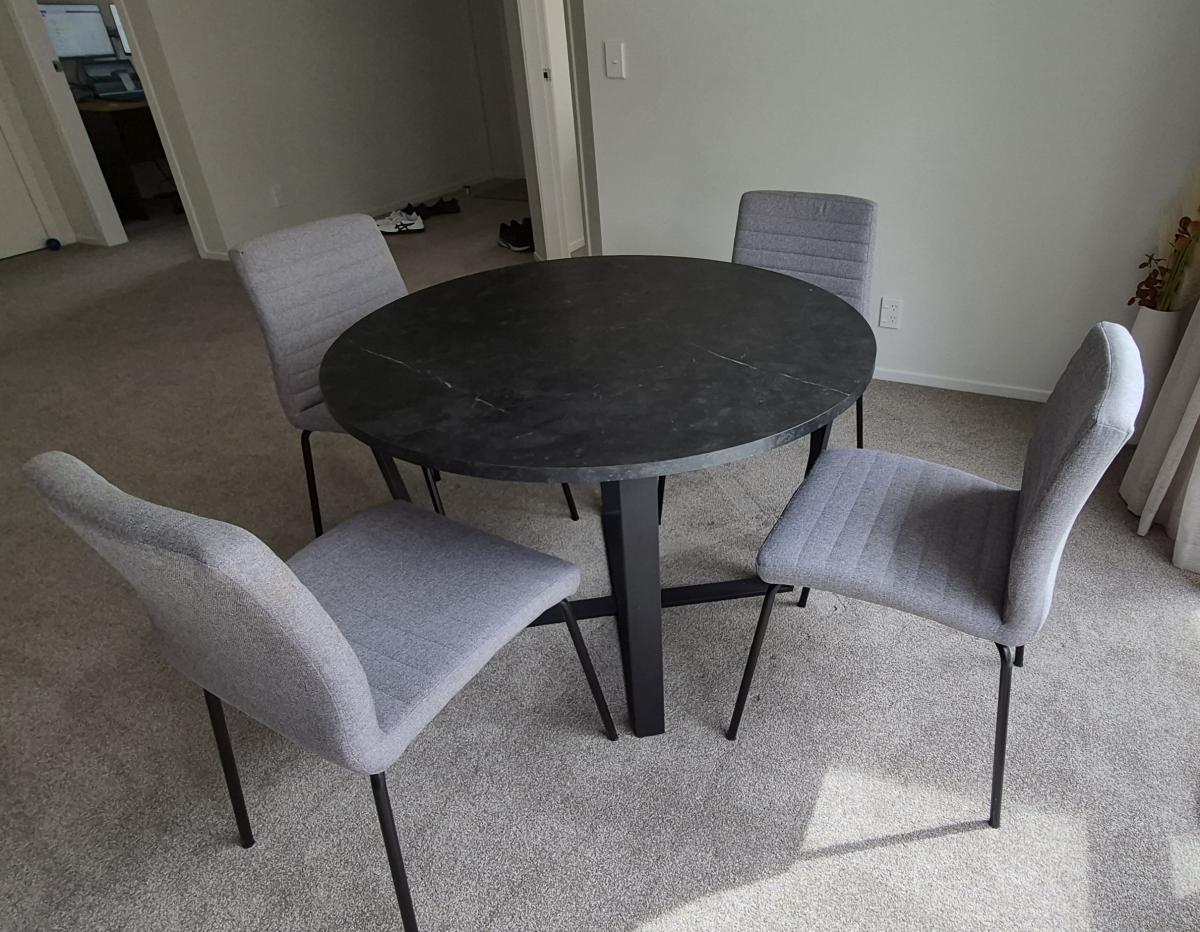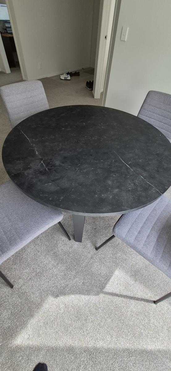 Round dining table with 4 chairs. In very good condition looking for a new home. Selling due to upgrade. Table diameter 100cm and height 74cms.