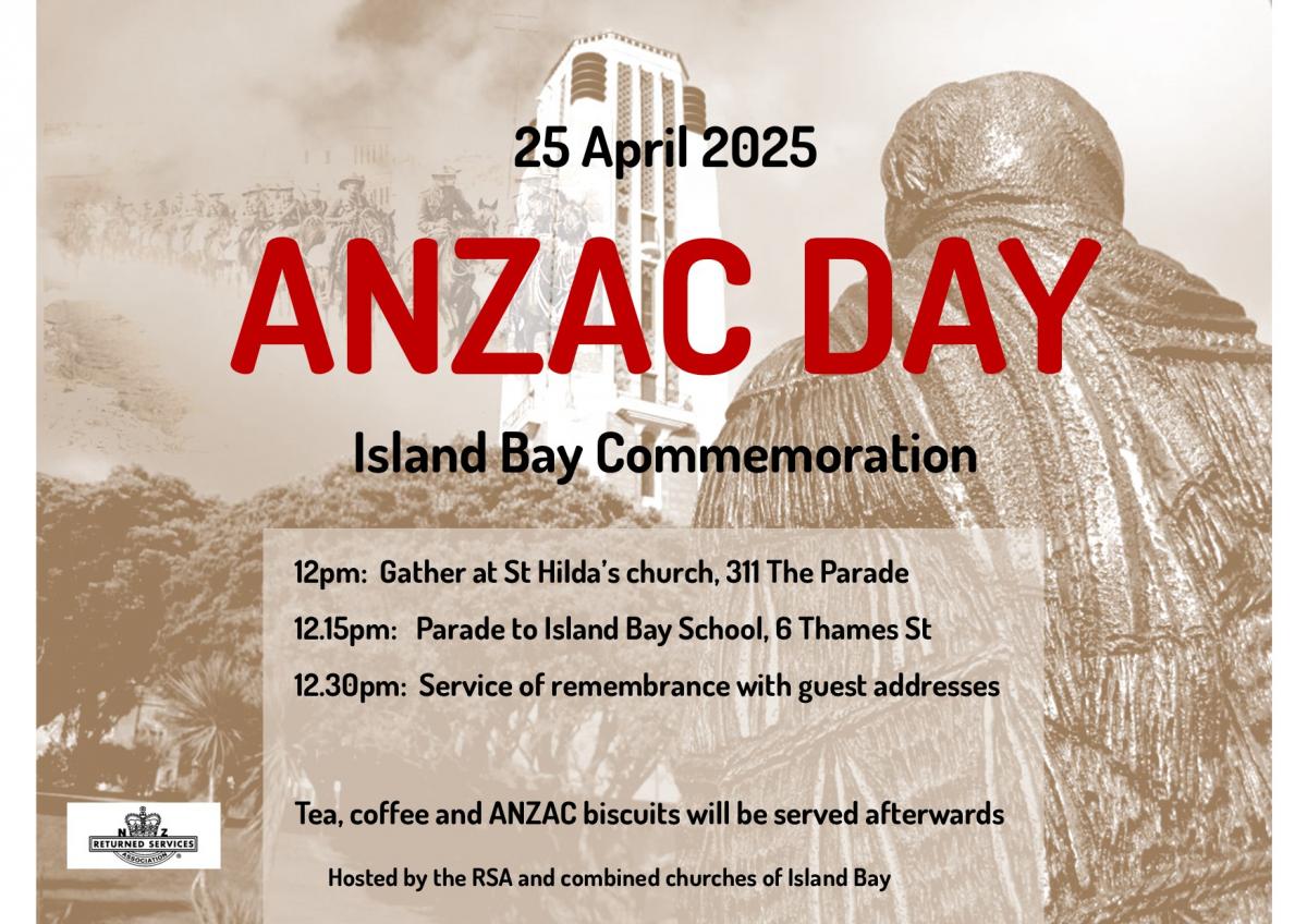 Commemorate ANZAC Day at Island Bay School on 25th April. You can also join the procession to the venue, at 12.15pm from St Hilda's. This parade is usually attended by local Scout, Guides & Rangers and Girls Brigade.