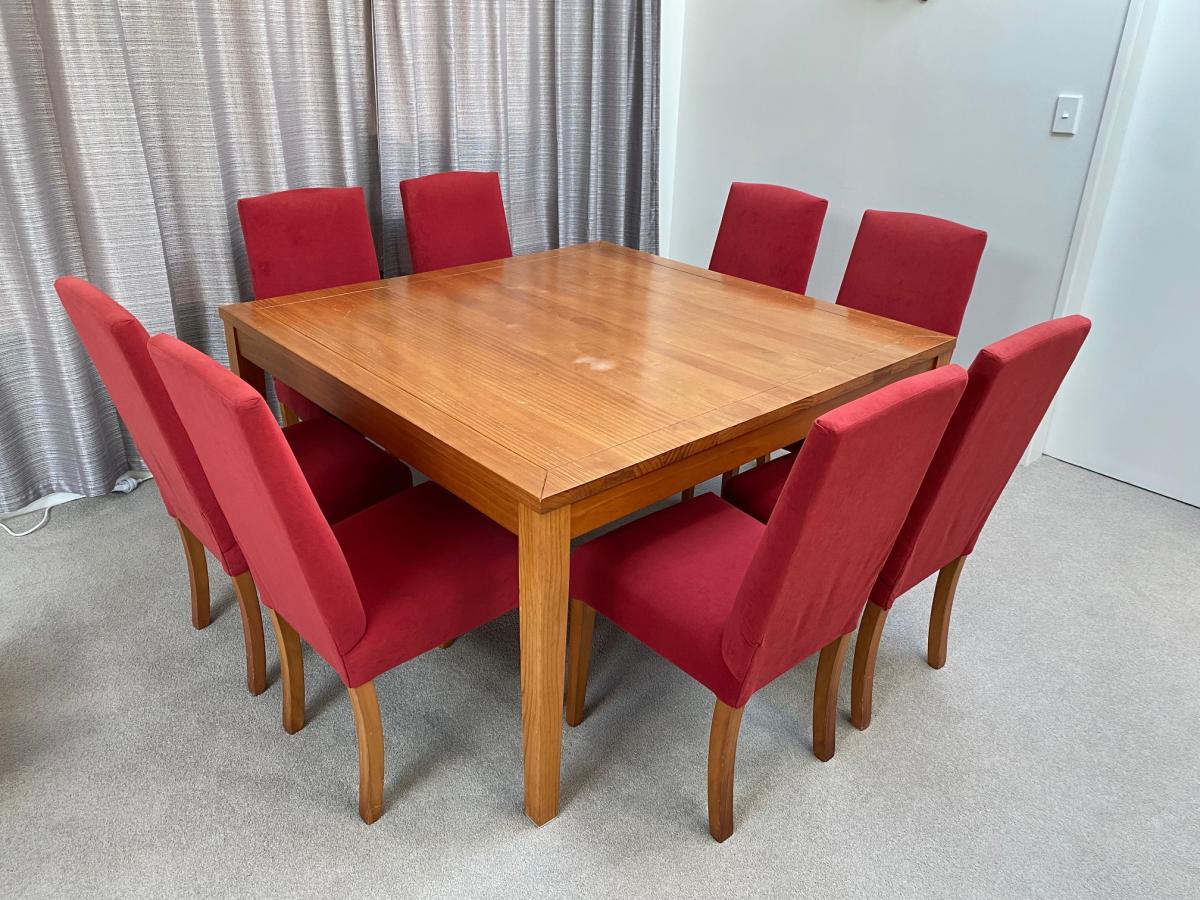 Condition is good except for a few scratches/marks and general wear and tear. An ideal size for hosting a large family. Includes the 8 padded dining chairs plus a few matching cushions and table cloth.