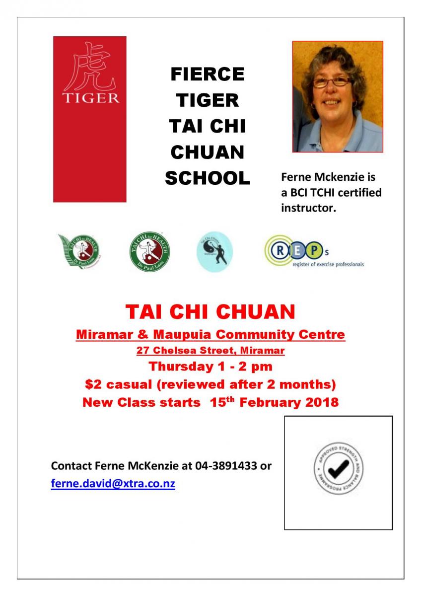 Tai Chi classes starting at Miramar & Maupuia Community Centre, 27 Chelsea Street, Thursday 15th Feb, 1-2 pm, $2 casual.