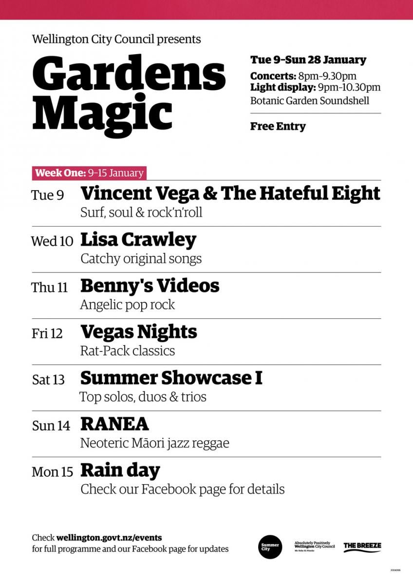 Gardens Magic starts tonight, check out the schedule for Week One. Tonight (Tues 9 Jan) it's Vincent Vega & The Hateful Eight: Tarantino-inspired surf, soul and rock โnโ roll classics from cult films. Free concert 8pm - 9:30pm & light display around the Botanic Garden 9pm-10:30pm. … View moreGardens Magic starts tonight, check out the schedule for Week One. Tonight (Tues 9 Jan) it's Vincent Vega & The Hateful Eight: Tarantino-inspired surf, soul and rock โnโ roll classics from cult films. Free concert 8pm - 9:30pm & light display around the Botanic Garden 9pm-10:30pm. |More info| wellington.govt.nz...