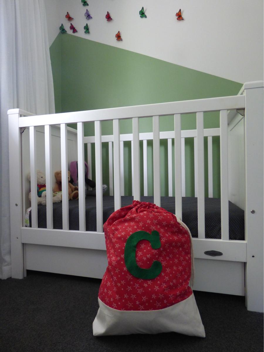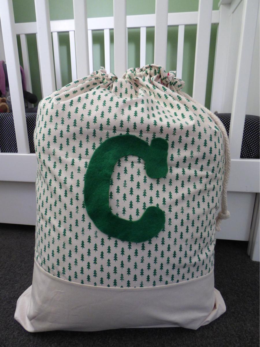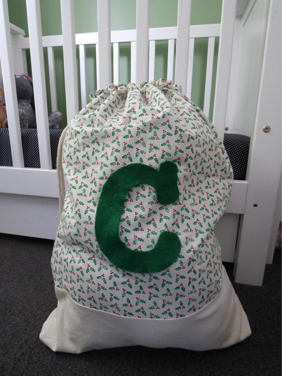 I have made a small number of Santa sacks to sell since the ones I made last year were a hit with the family. They are fully lined and have a rope drawstring at the top. The sacks come with a personalised green felt initial (photo has a C for demonstration purposes).