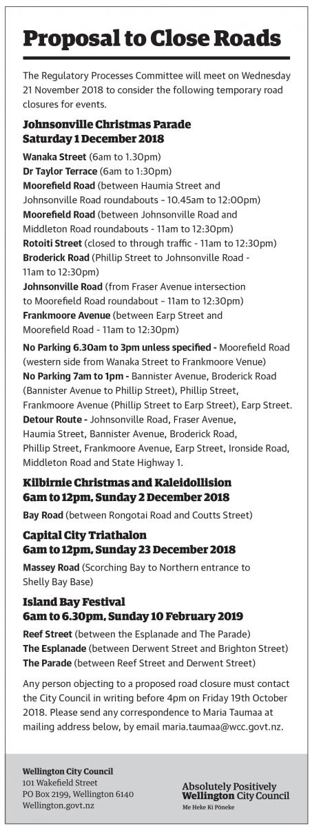 Our Regulatory Processes Committee will meet to consider some temporary road closures for Johnsonville Christmas Parade, Kilbirnie Christmas and Kaleidollision, Capital City Triathalon and Island Bay Festival. If you object to this proposed road closure or would like to give your feedback you can … View moreOur Regulatory Processes Committee will meet to consider some temporary road closures for Johnsonville Christmas Parade, Kilbirnie Christmas and Kaleidollision, Capital City Triathalon and Island Bay Festival. If you object to this proposed road closure or would like to give your feedback you can email maria.taumaa@wcc.govt.nz before 4pm, Friday 19 Oct.