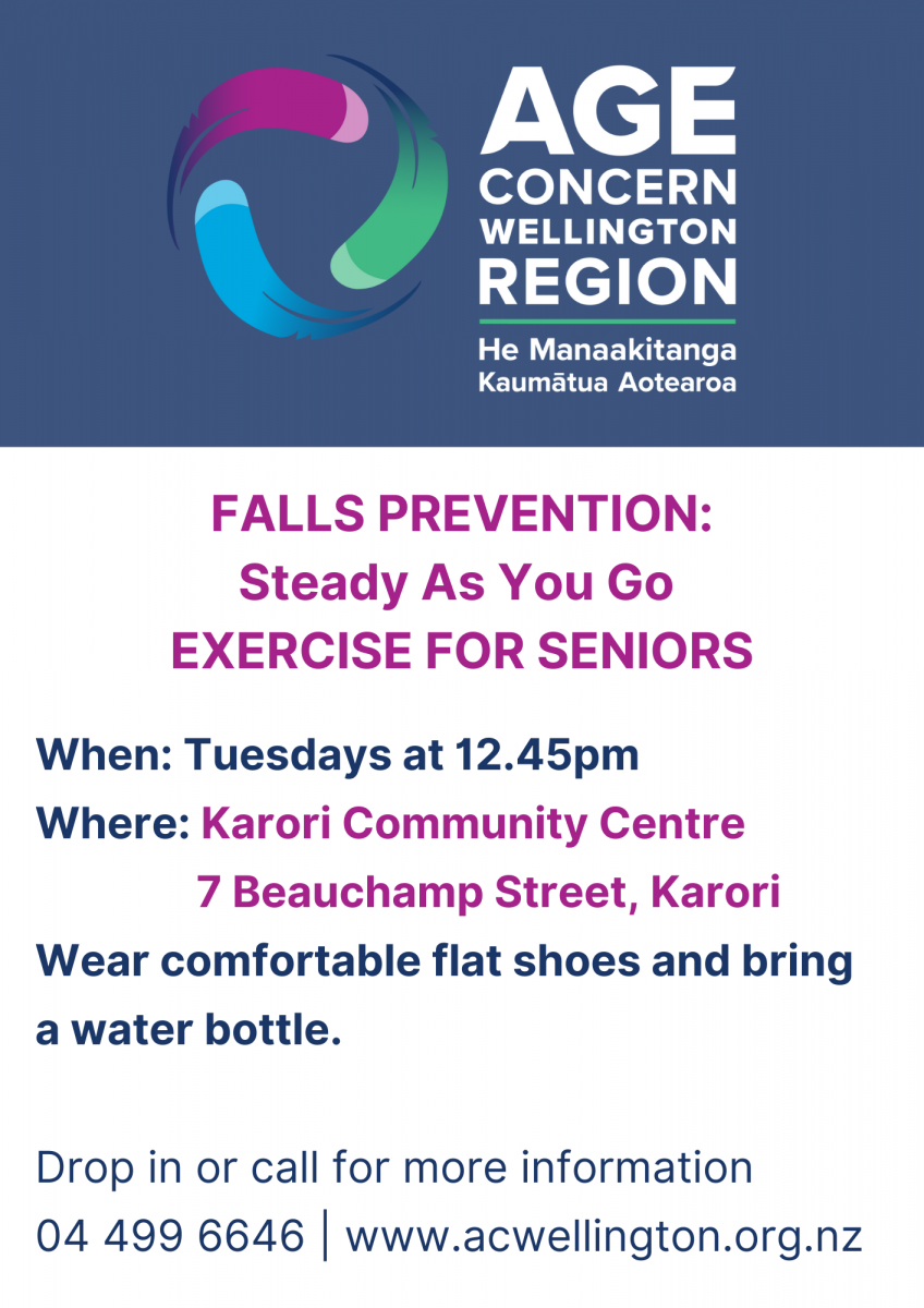 There is now an extra Steady As You Go Class in Karori on Tuesdays at 12.45pm.