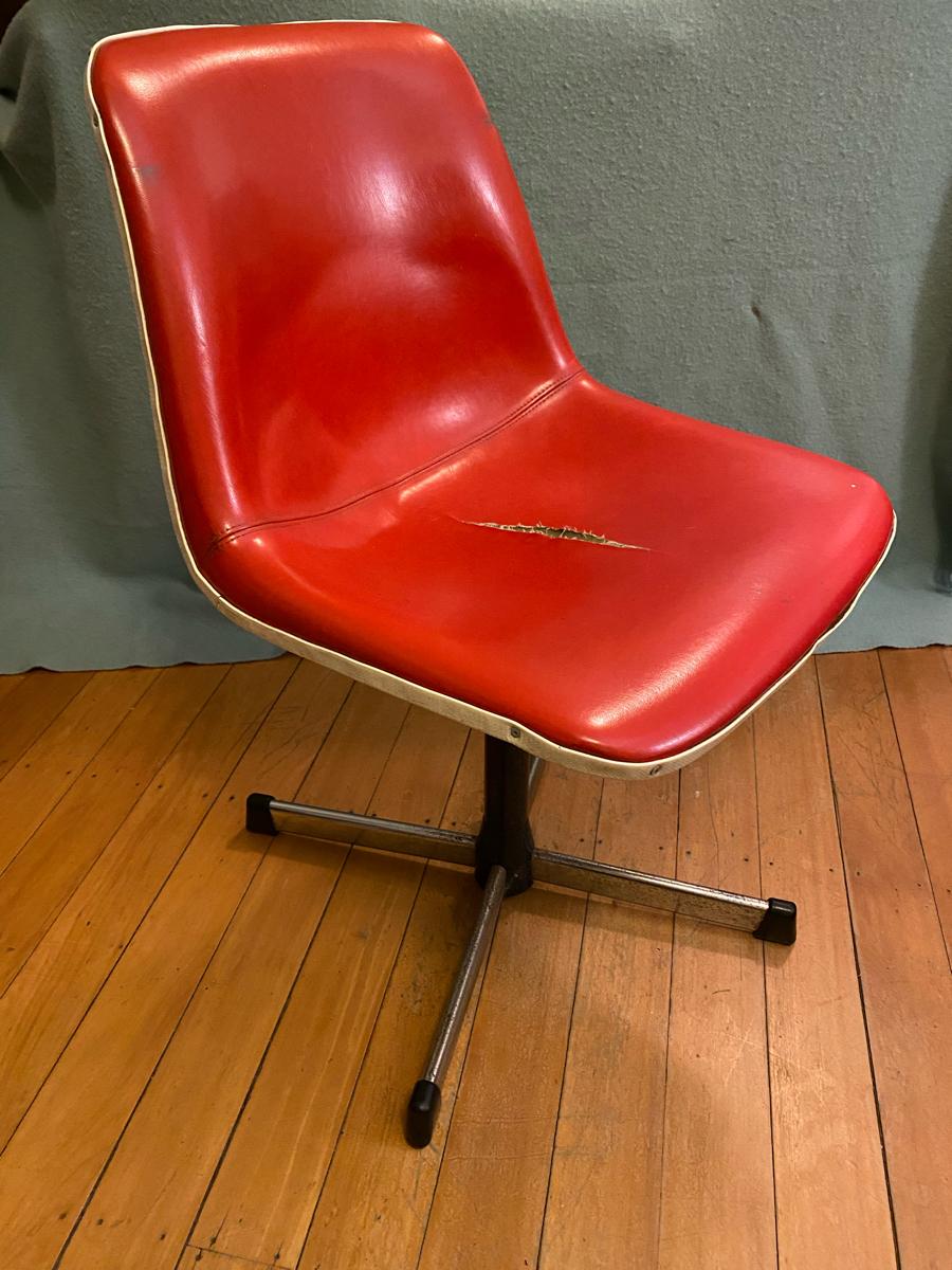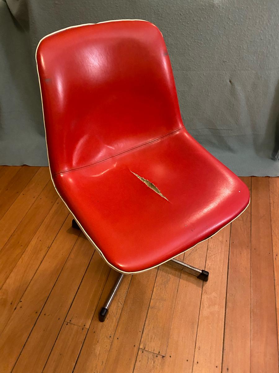 Free vinyl, plastic and metal swivel chair. Big tear in the centre of the seat unfortunately, but otherwise still comfy to sit on.