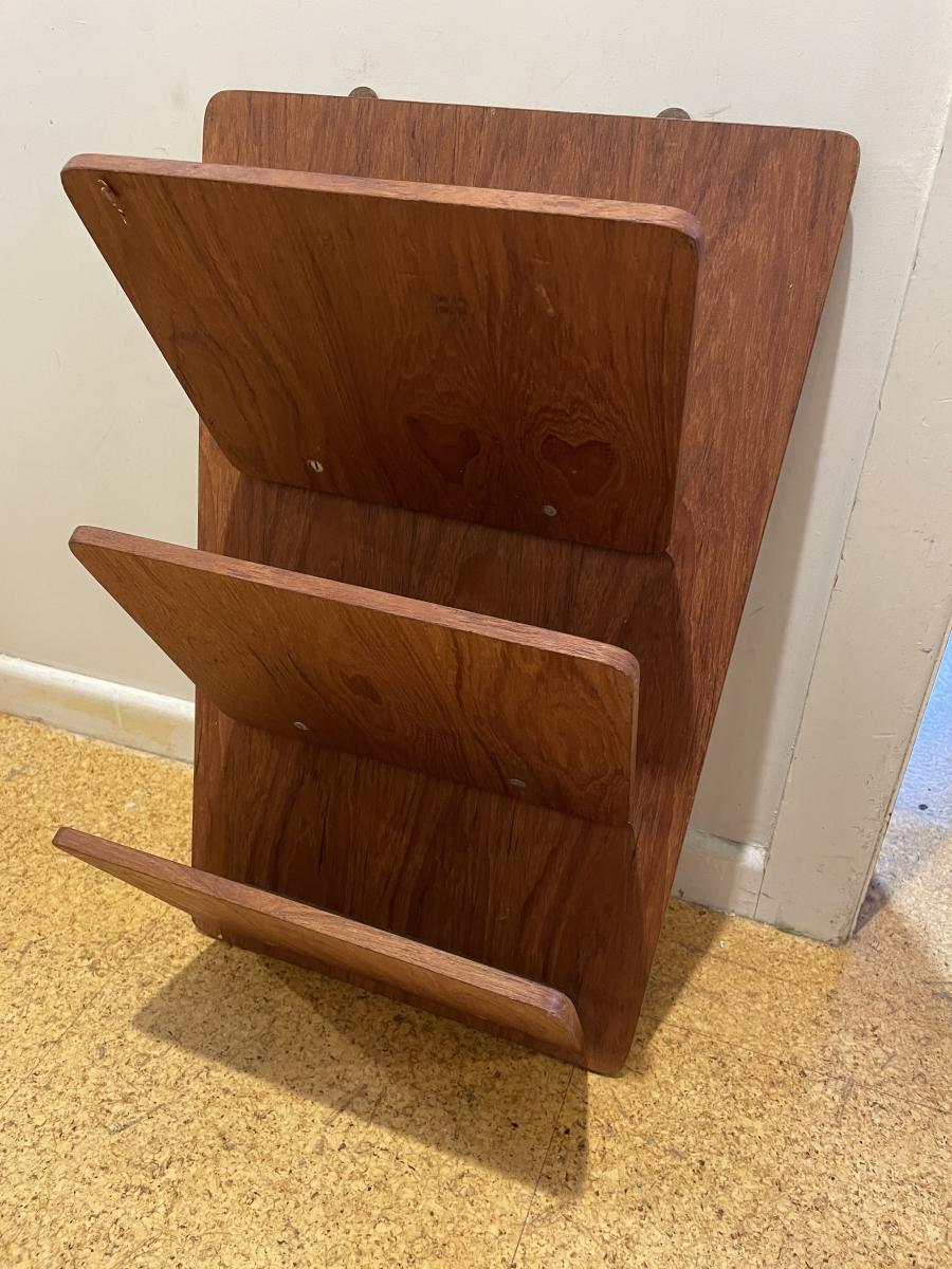 Solid wood (teak) hanging filer with 3 slots. Good condition. Takes A4 sized paper