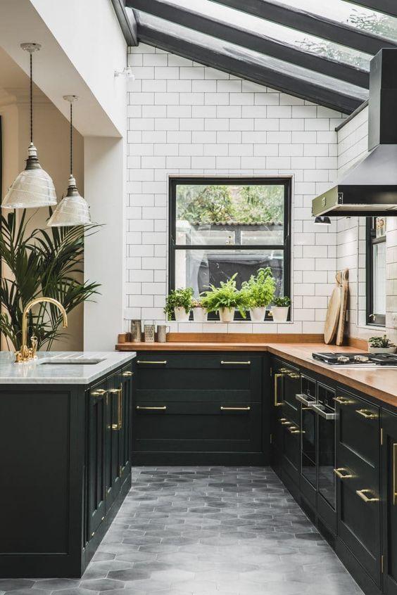 White wall tiles, dark wooden cabinetry, and gold fixtures and fittings make for the perfect modern farmhouse 😍
