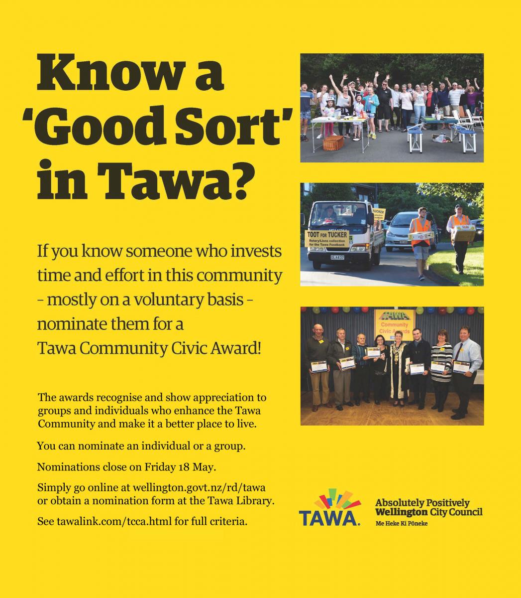 More… View moreThis is YOUR CHANCE to nominate volunteers in the Tawa community for the upcoming Tawa Community Civic Awards. The awards are held every two years by the Tawa Community Board. Each nominee will receive a certificate of appreciation from the Mayor at a special ceremony in Tawa in early June.