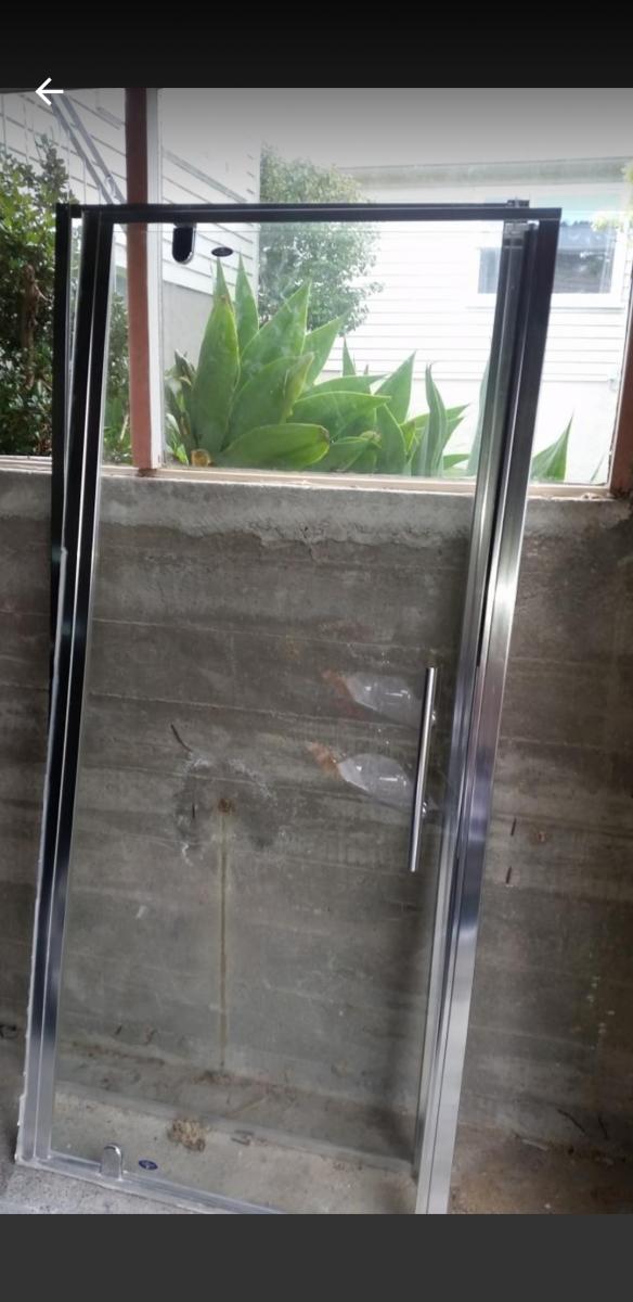 Glass shower doors, one solid panel and one door opening, with handle. 900 x 900