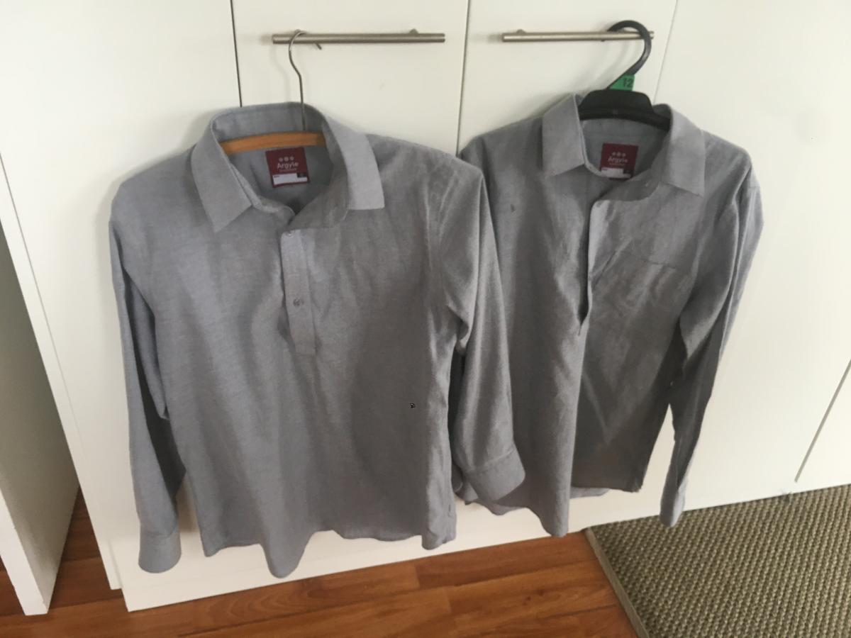 Two long sleeve boys shirts, size 12, one in excellent condition$20 and the other with a small rip on the … View moreI have two size 14 short sleeve boys shirts. Worn for two years. One in excellent condition, $15. The other has a rip underneath along the under arm of the sleeve that has been sewn up $5.