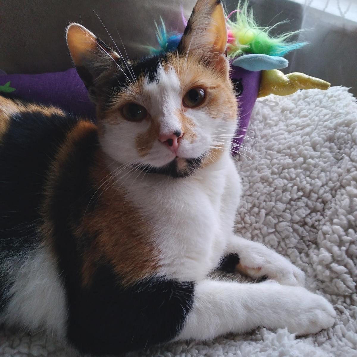 Lightning is Calico breed, two years old, weight 4.9.
