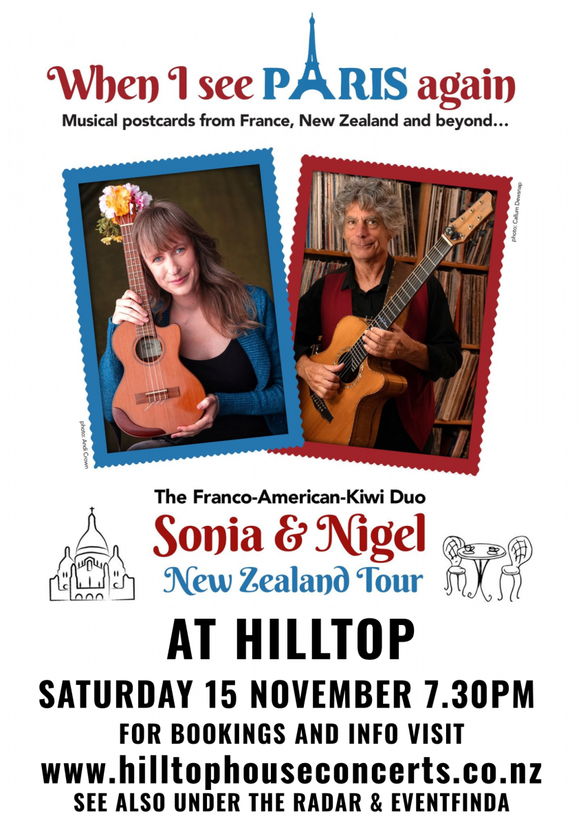 It's on tomorrow! Saturday 15 November 7.30pm - When I see Paris Again - A multi-cultural acoustic duo featuring French-American Paris-born Sonia Wilson on vocals & ukulele and Kiwi-American virtuoso musician Nigel Gavin on 7-string guitar. After meeting and playing together for the first … View moreIt's on tomorrow! Saturday 15 November 7.30pm - When I see Paris Again - A multi-cultural acoustic duo featuring French-American Paris-born Sonia Wilson on vocals & ukulele and Kiwi-American virtuoso musician Nigel Gavin on 7-string guitar. After meeting and playing together for the first time at the Whare Flat Folk festival in Dunedin during Sonia’s first visit to New Zealand in December 2014, the pair have become a well-loved duo in the New Zealand folk music scene. They weave French, Kiwi and American songs with their own original compositions and inspiration from their travels around the world. They are also both members of the wonderful Unsung Heroes. Come along for the lovely house concert vibe ... www.hilltophouseconcerts.co.nz......