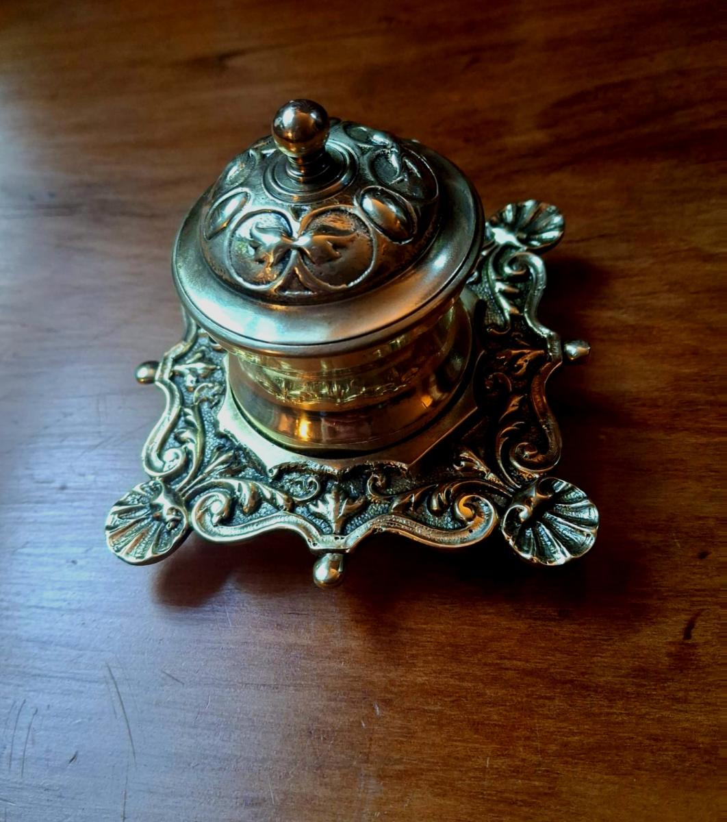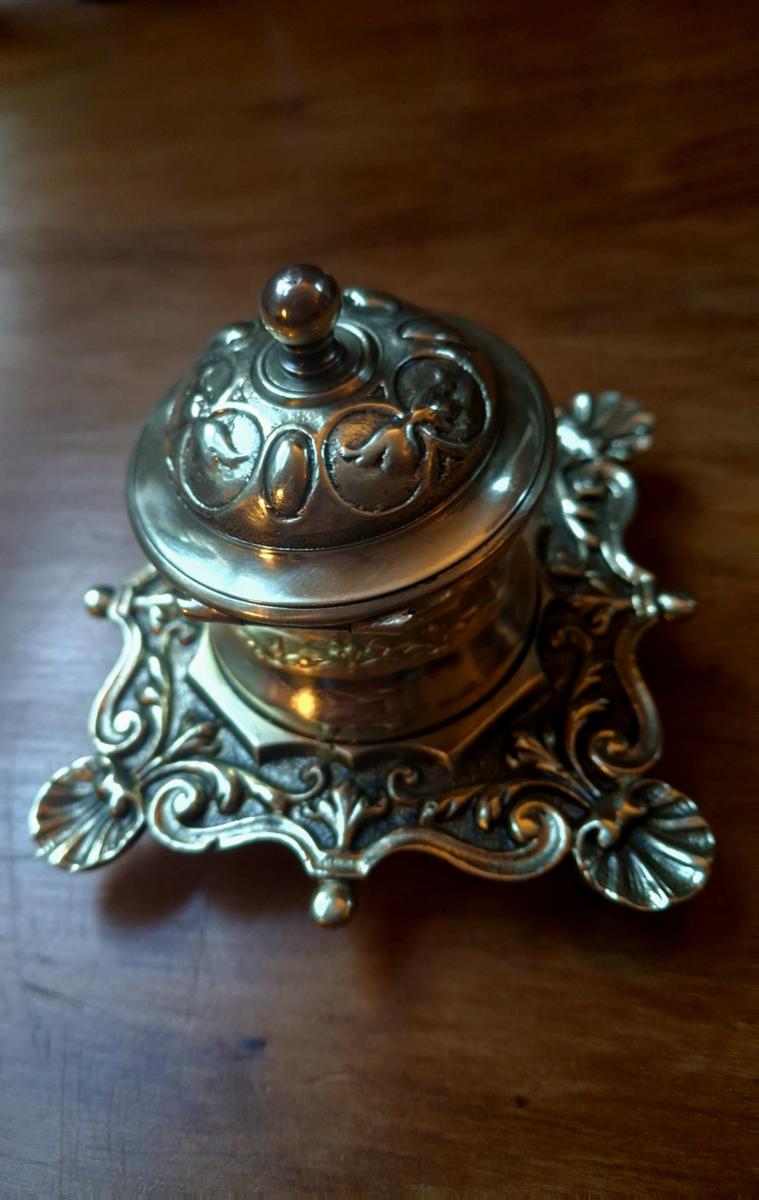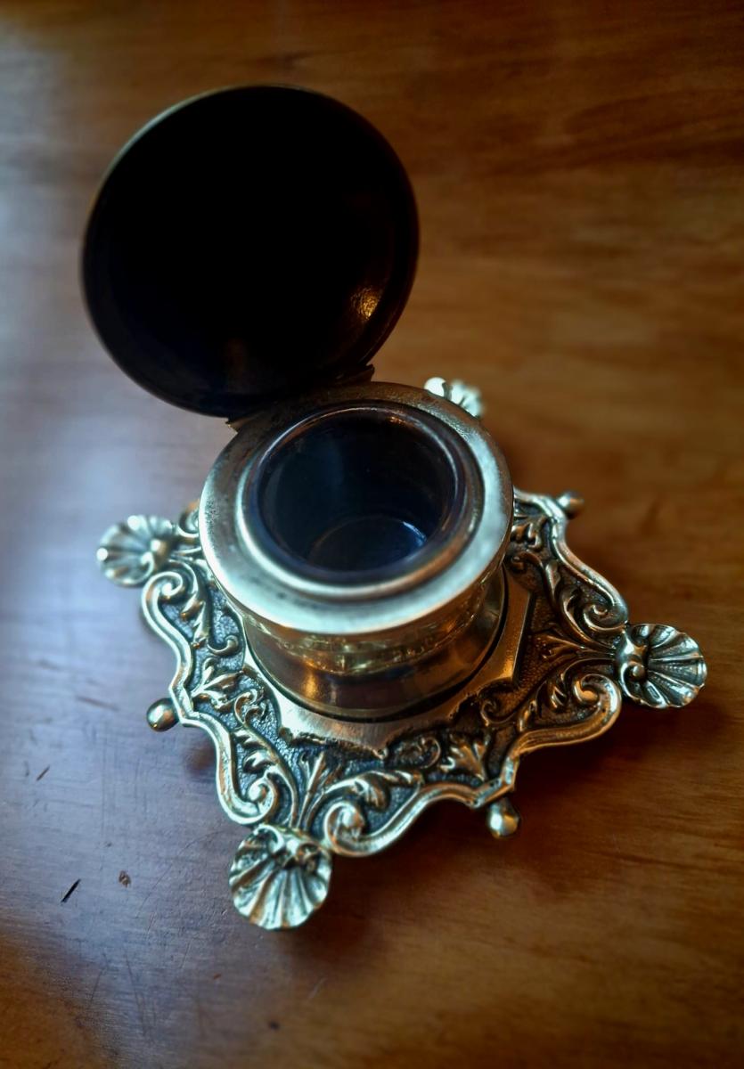 It was cast in brass, long, long ago, has a hinged cover and the original glass inkwell.