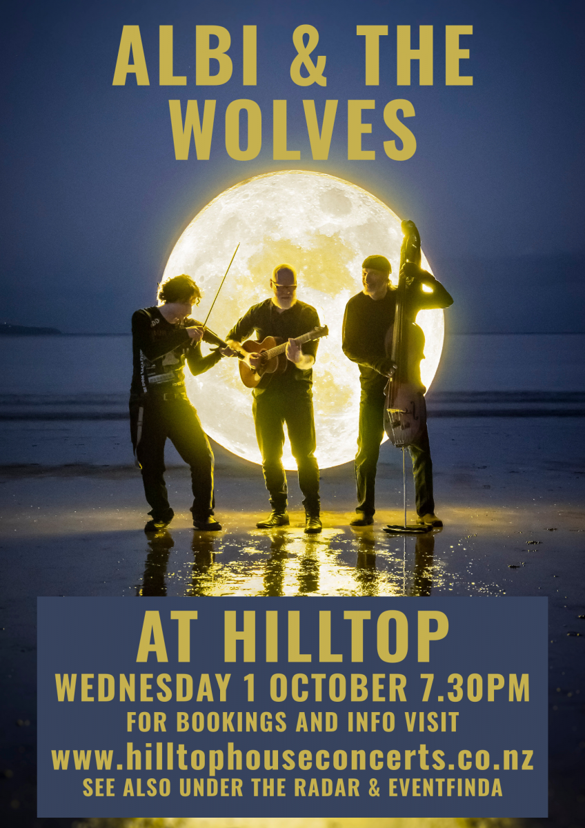 Wednesday 1st October! These great guys set fire to stages and fill hearts with hope with their energetic and relatable alternative indie folk songs. Proud albino frontman Albi (Chris Dent), Pascal Roggen and Michael Young have crafted a stage show brimming with energy yet with pauses for … View moreWednesday 1st October! These great guys set fire to stages and fill hearts with hope with their energetic and relatable alternative indie folk songs. Proud albino frontman Albi (Chris Dent), Pascal Roggen and Michael Young have crafted a stage show brimming with energy yet with pauses for reflection. The trio has a huge sound created simply by acoustic guitar, electric violin, double bass and three voices. Since 2014, Albi & the Wolves have gone from strength to strength touring Australia, New Zealand and Rarotonga. In 2018, they took home the Best Folk Artist Award at the NZVMAs. Fundraising now for their World Tour! Whether it’s connection through dance, singing or laughter, their performances inspire audiences to keep coming back for more. Come along for the special House Concert vibe. Not for profit, supporting our dedicated musicians. Teas, coffee and snacks provided. More information at www.hilltophouseconcerts.co.nz.....................