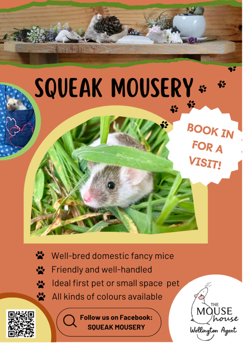 We are the Wellington Agent for the Mouse House NZ, a respected breeder and supplier of pet domestic fancy mice. Our mice make wonderful first pets or pets for small suburban homes - get in touch to book a viewing if you'd like to have a mouse snuggle and to discuss their care! Find us on … View moreWe are the Wellington Agent for the Mouse House NZ, a respected breeder and supplier of pet domestic fancy mice. Our mice make wonderful first pets or pets for small suburban homes - get in touch to book a viewing if you'd like to have a mouse snuggle and to discuss their care! Find us on Facebook at Squeak Mousery NZ. We are located in Northland, Wellington.