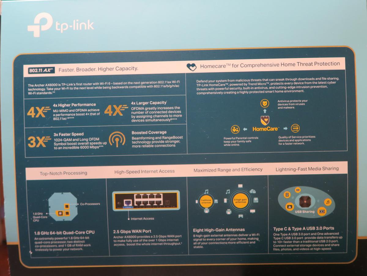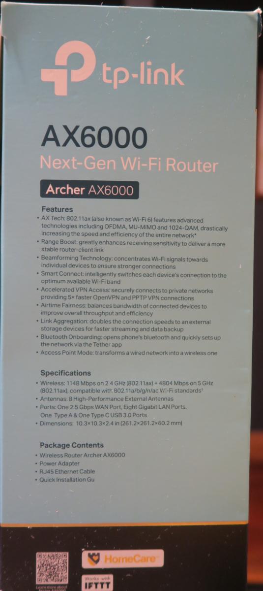 For sale is a new TP-LINK AX6000 WiFi 6 Router. It is a high performance router with 6 antenna support the 802.11AX standard. It is enough to cover a medium size house on its own. It also has a 2.5Gps port which will be good for Hyperfibre if you are into ultra performance speed.